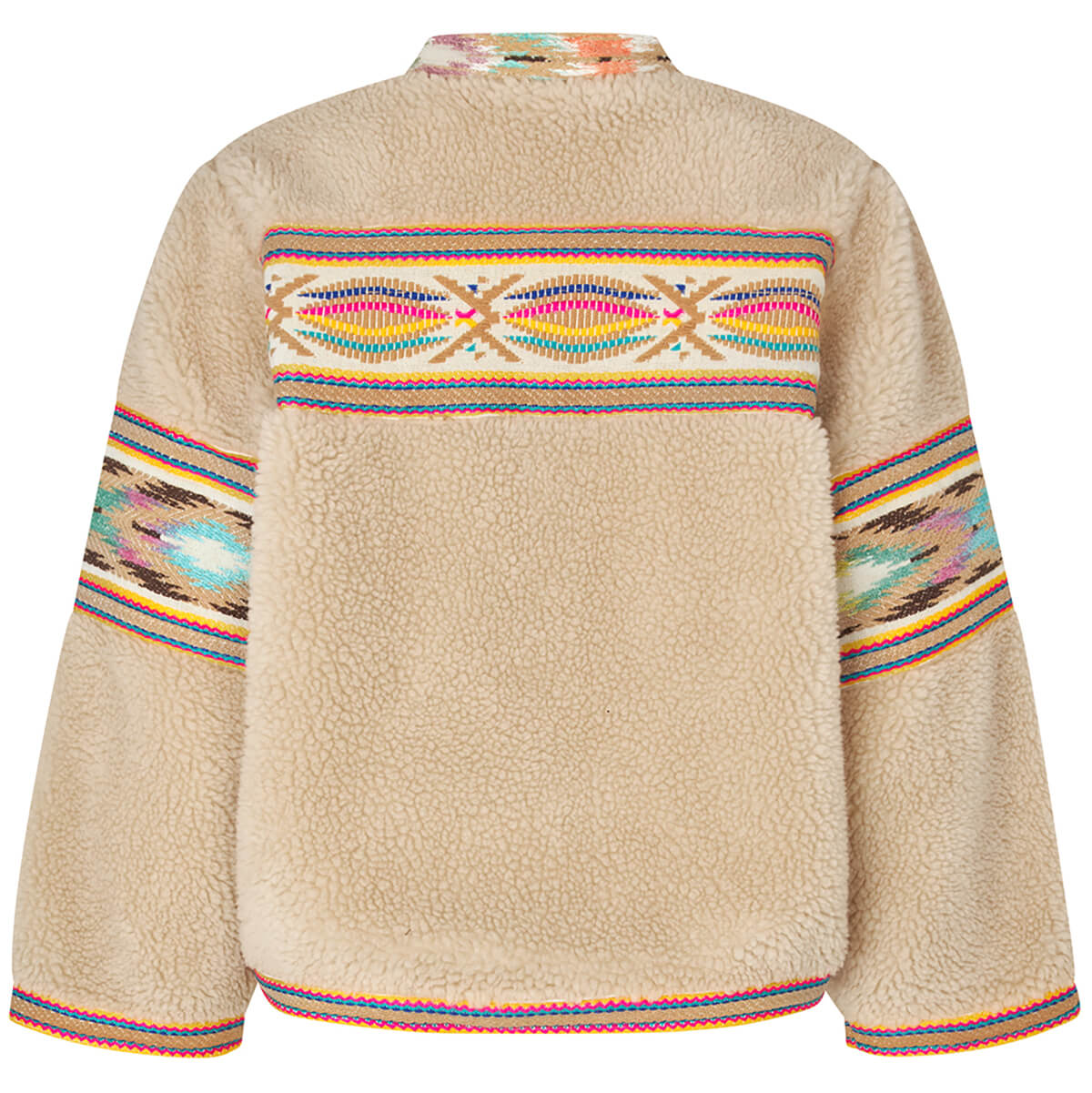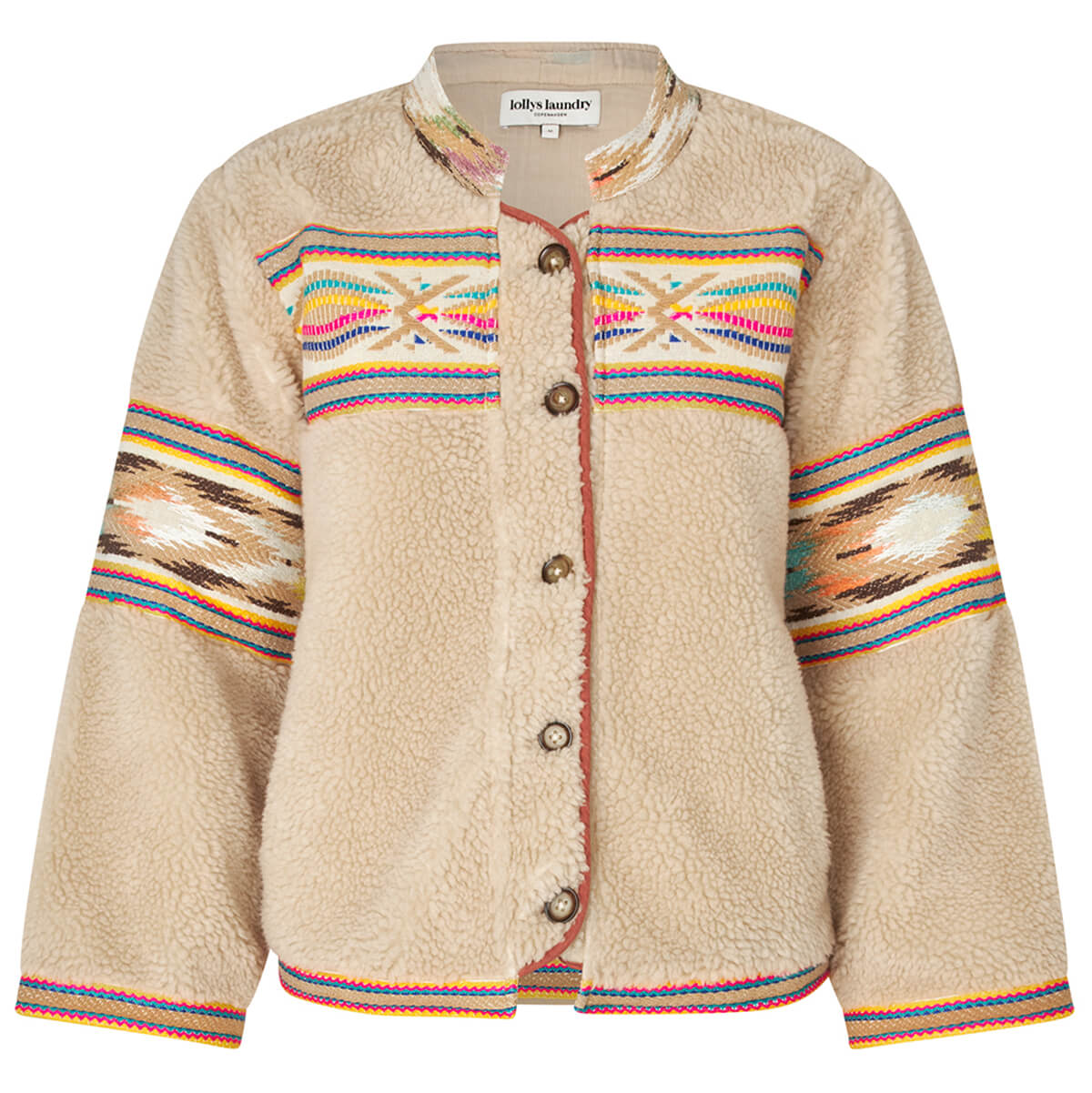 Siri Jacket by Lollys Laundry. Wrap yourself in soft comfort with a touch of colour. Siri is the perfect teddy jacket, combining warm materials with eye-catching embroidered details. With colourful embroidery on the chest, neck and hem.