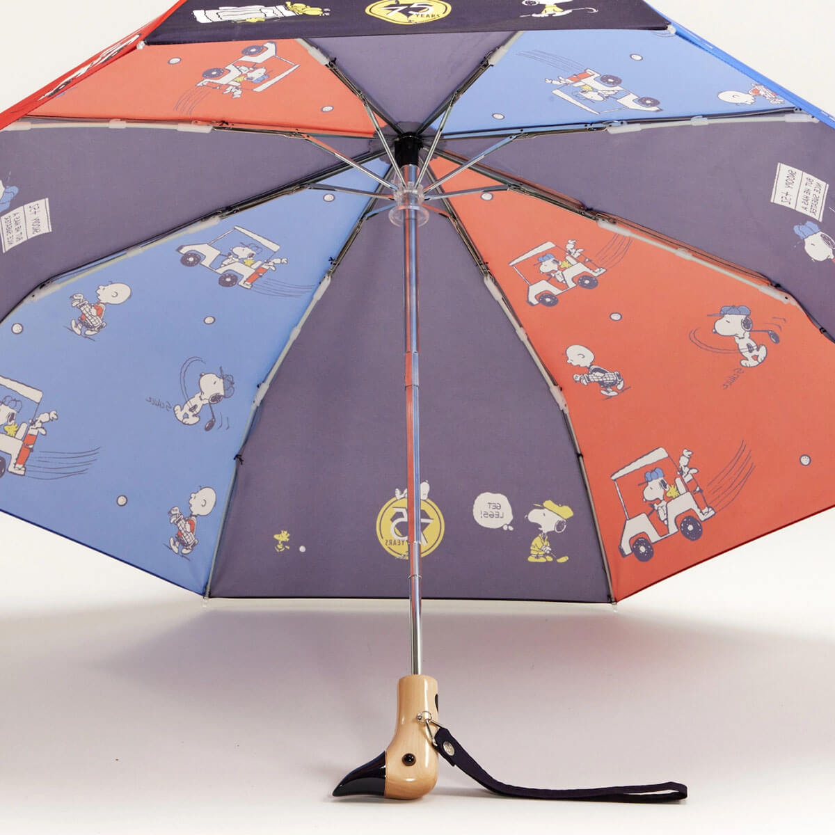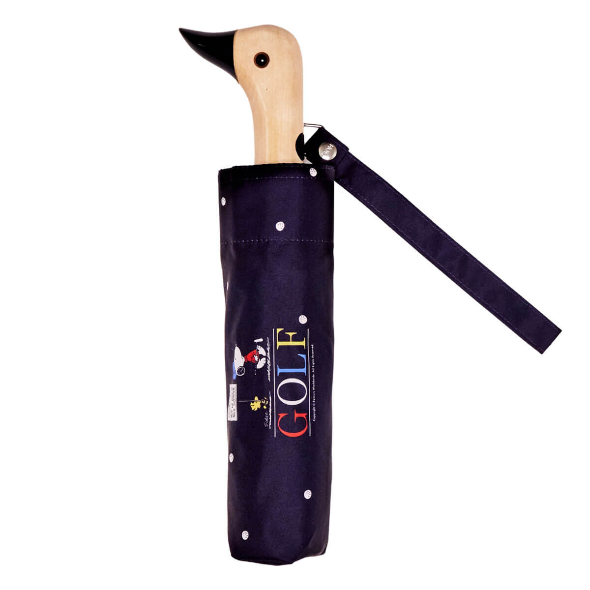 Snoopy Golf Umbrella by Peanuts x Original Duckhead. Meet the Original Duckhead x Peanuts Limited Edition Umbrella, a playful celebration of design, storytelling and everyday practicality. Created to mark 75 years of Snoopy and the gang, this exclusive collaboration brings together Original Duckhead’s iconic craftsmanship with the timeless charm of Peanuts. Each umbrella is crafted with the same attention to detail as the core Original Duckhead range. The canopy is made from 100% recycled plastic bottles and is completely PFAS-free, offering reliable water resistance without forever chemicals. The iconic duck-head handle is carved from one solid piece of sustainably sourced wood, giving every umbrella a unique natural finish.