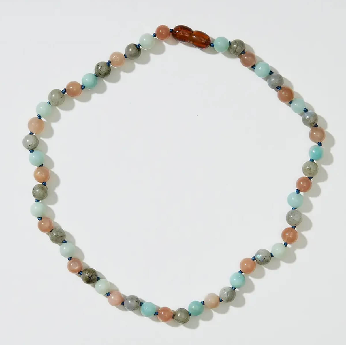 Holiday kids necklace in moonstone and cherry quartz by Nirrimis. Pretty handmade necklace featuring ethically sourced polished Baltic amber and semi-precious stones including moonstone, cherry quartz and cat's eye finished with an amber safety clasp. 38cm long including safety clasp.