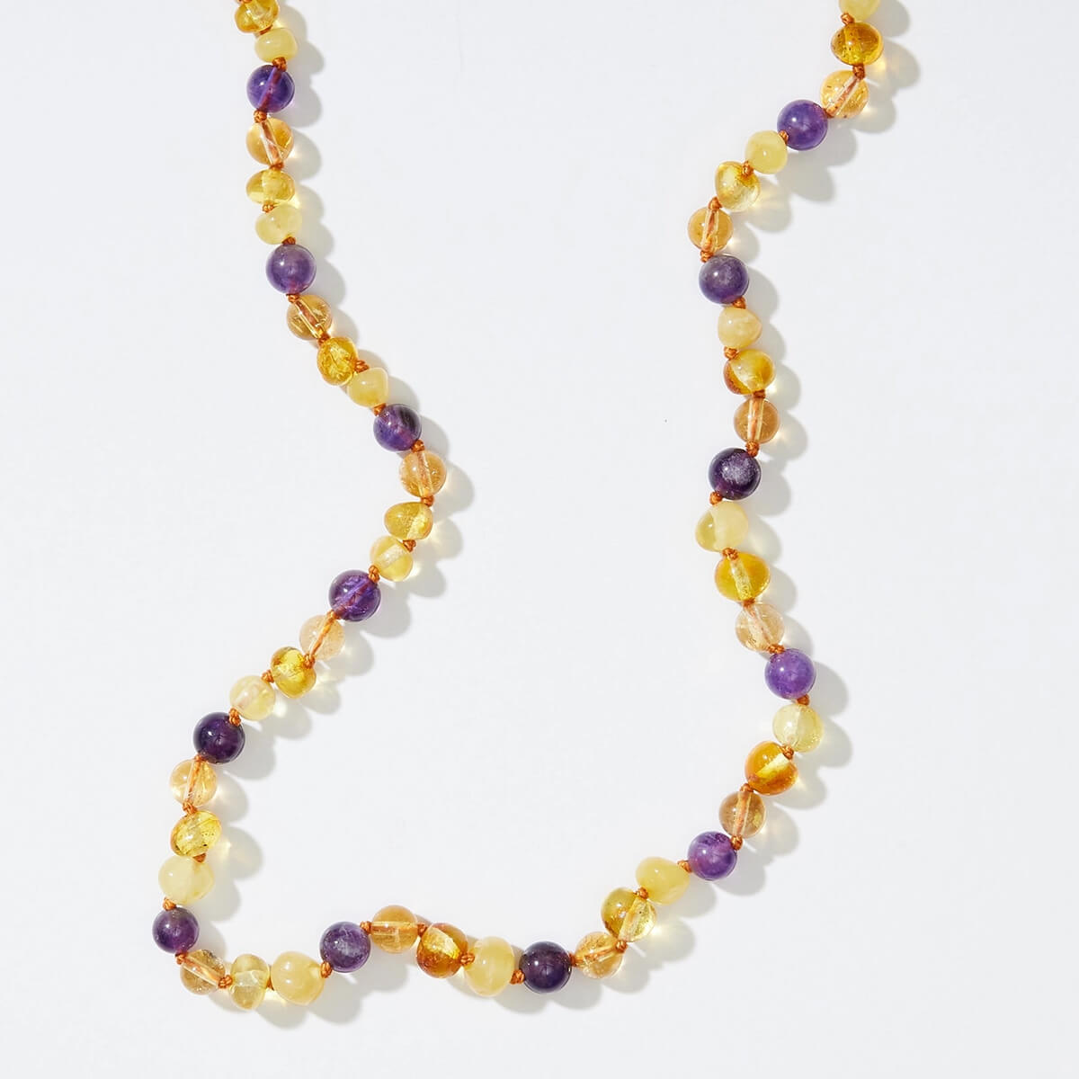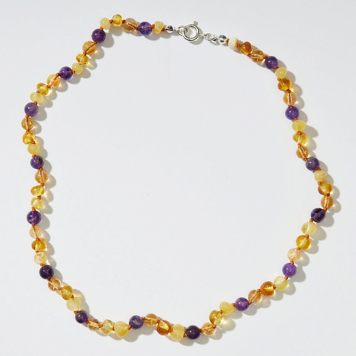 Posy adult necklace in amethyst and citrine by Nirrimis. Pretty handmade necklace featuring ethically sourced polished Baltic amber and semi-precious stones including amethyst, citrine and polished amber finished with a 925 sterling silver bolt ring clasp. 45cm long in length to fall just below the collarbone and a perfect length for everyday wear.