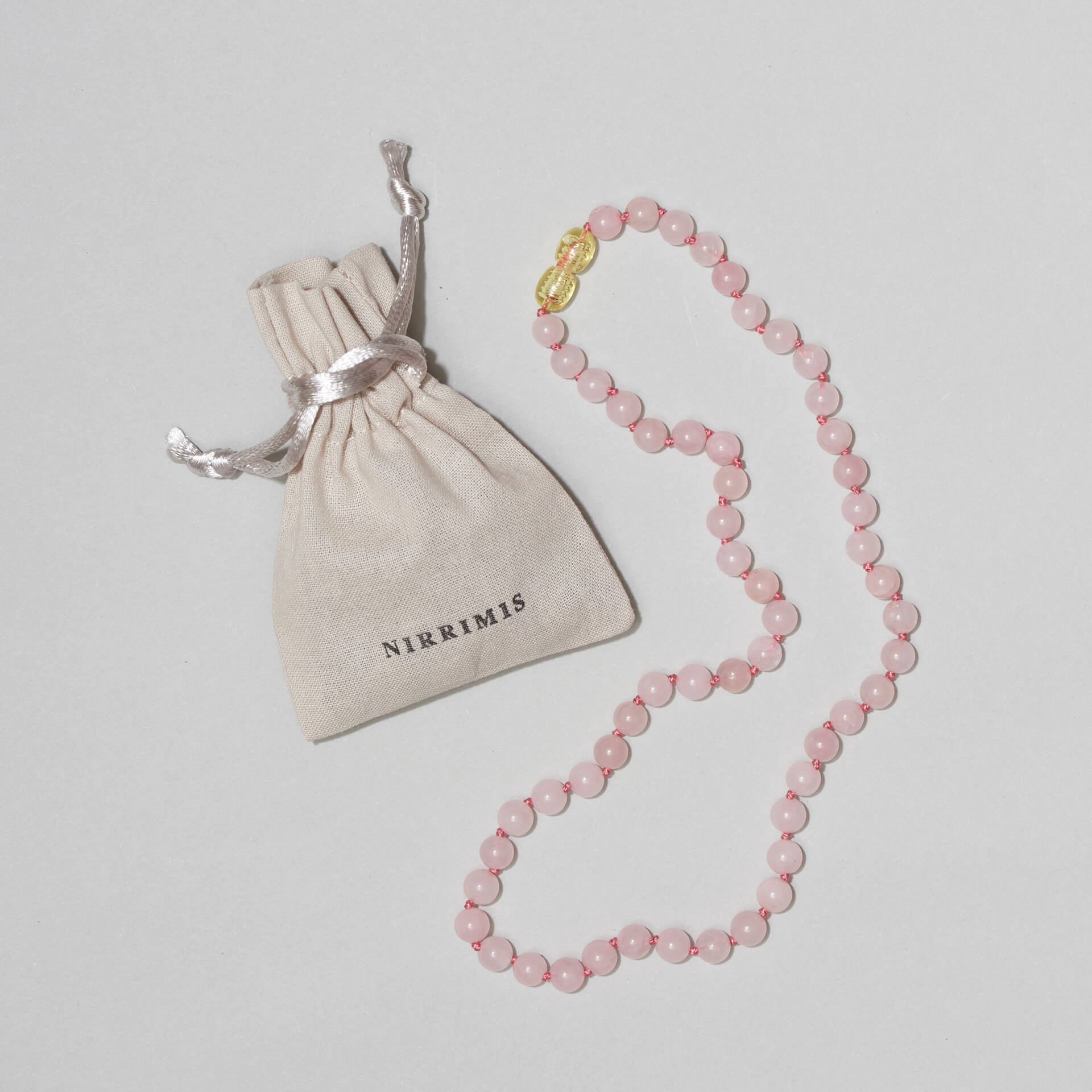 Rose Quartz kids necklace by Nirrimis. Pretty handmade necklace featuring ethically sourced polished raw lemon amber and rose quartz semi-precious stones. 38cm long including safety clasp.