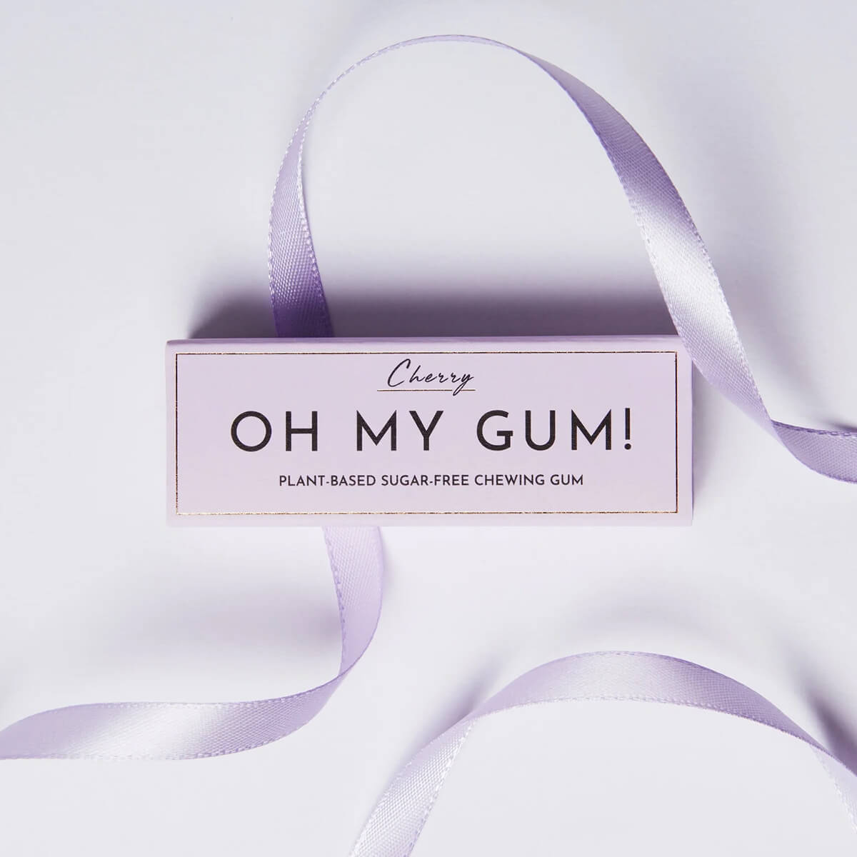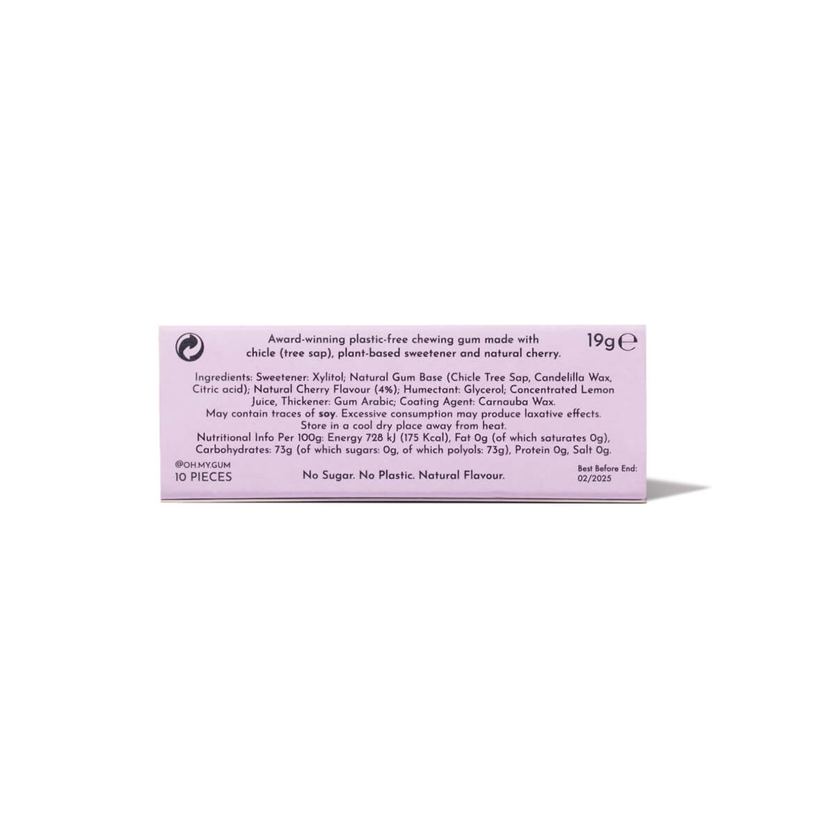 Cherry Chewing Gum by Oh My Gum! Super tasty cherry chewing gum made with xylitol, a natural sweetener derived from plants, this refreshing gum offers a burst of fruity cherry with every chew. Unlike traditional chewing gum, Oh My Gum! is made with 100% plant-based ingredients and is not made with any plastic. It is sugarless, GMO-free and is planet-friendly and vegan certified. The packaging is 100% reyclable.