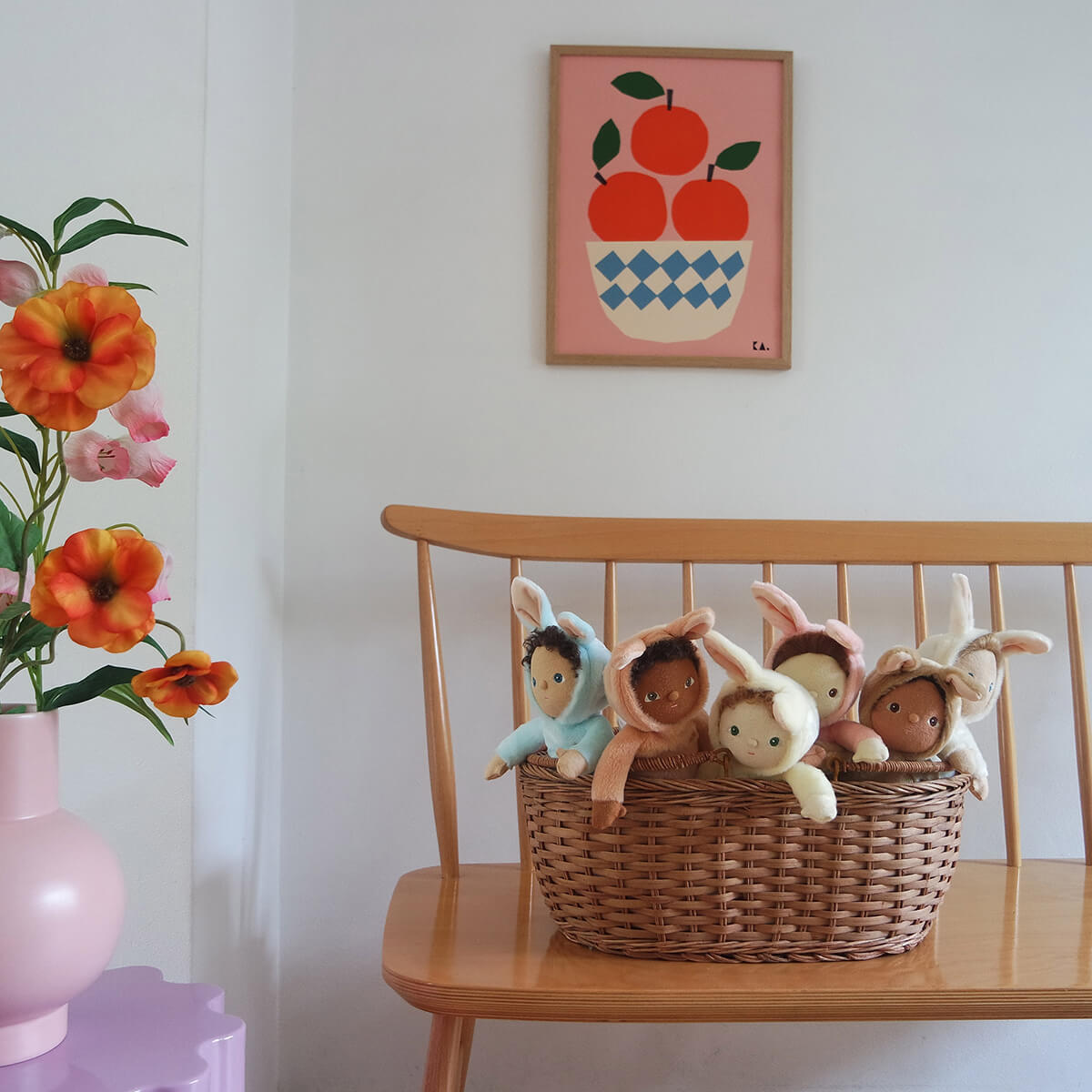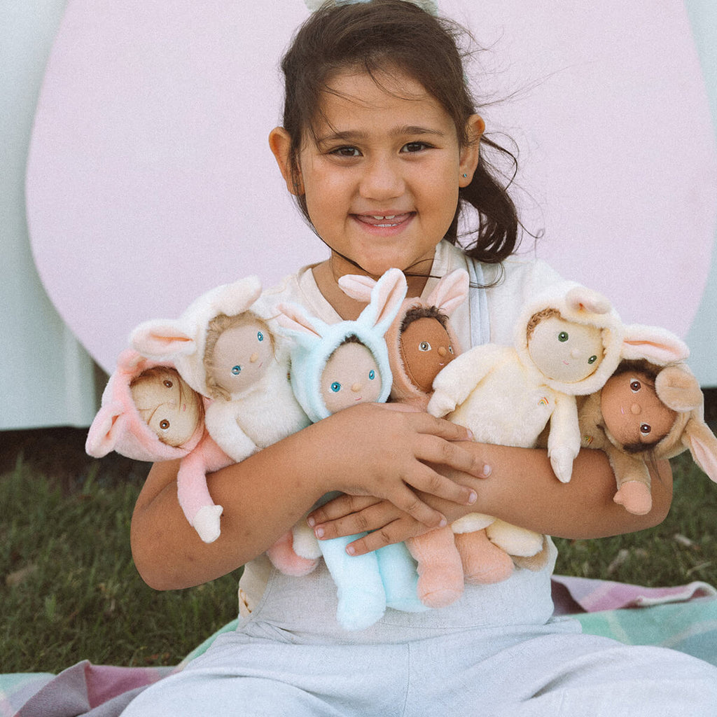 Babs Bunny Dinky Dinkum Fluffle Family Doll by Olli Ella. Bouncing into playtime (and Easter baskets), Dinky Dinkum Babs Bunny is here to add a dash of cheeky charm to your little one’s day. Limited-edition, pocket-sized, and weighted in all the right snuggly places, Babs is ready for any adventure! Features a snuggly non-removable onesie, and a posable body with gentle weighting inside.