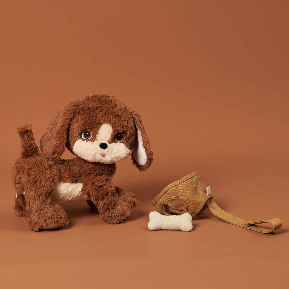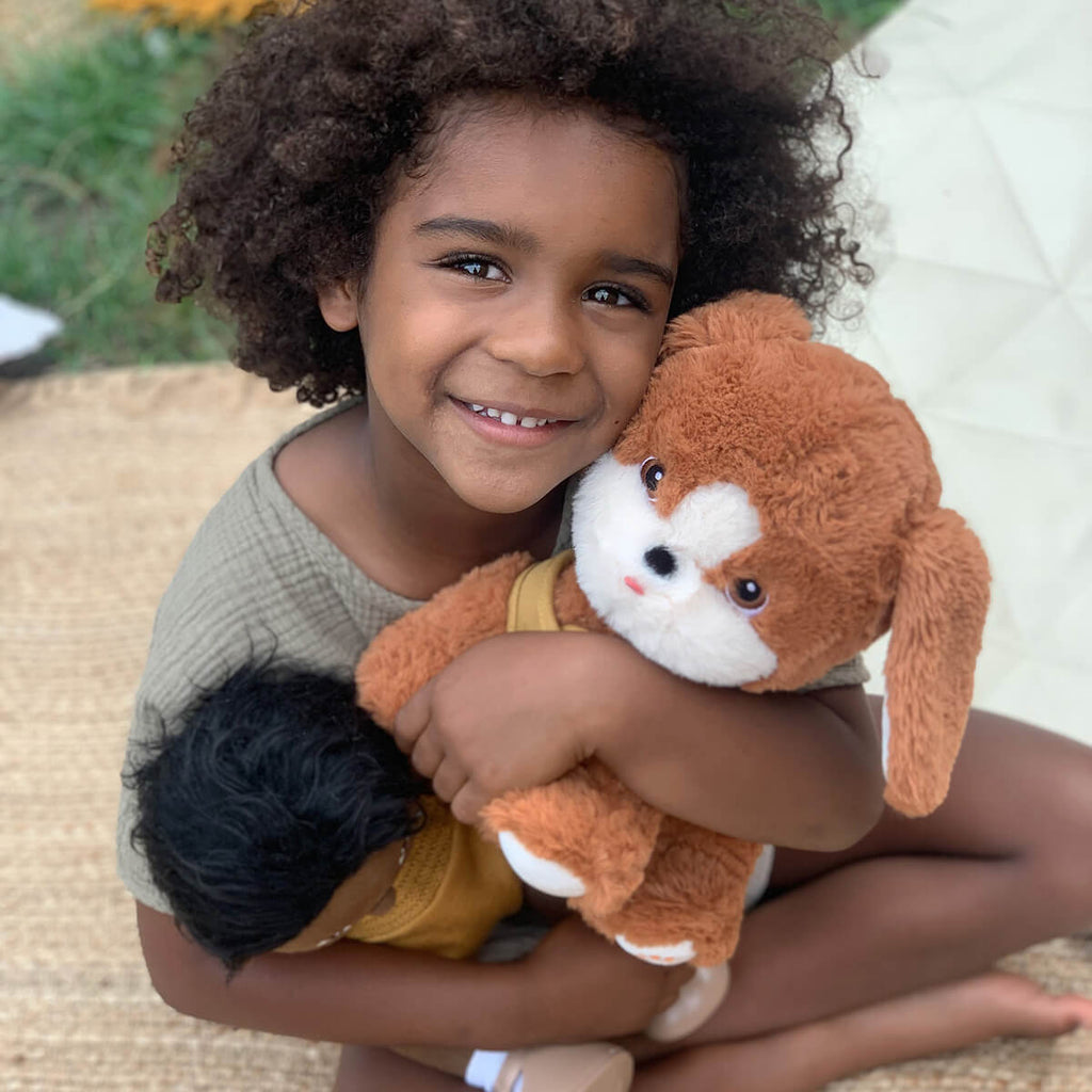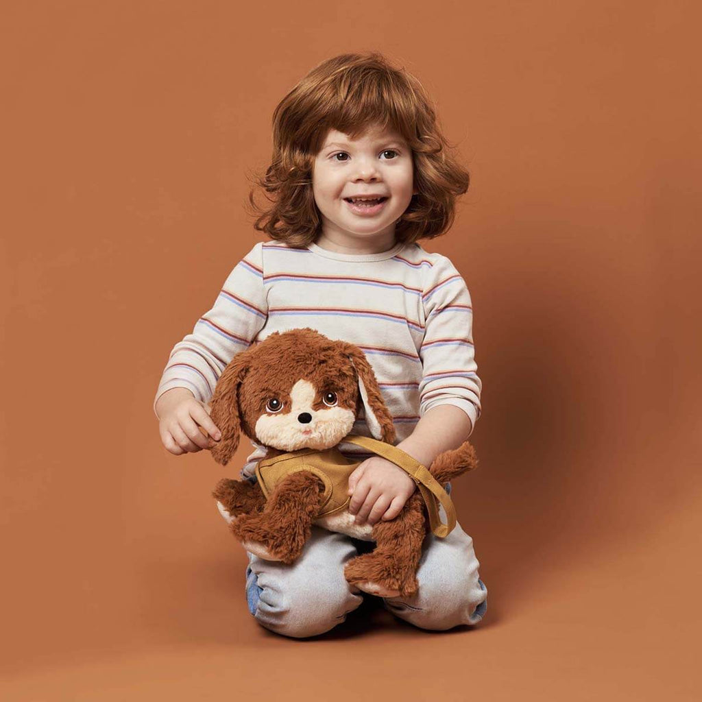 Dinkum Dogs Buddy doll by Olli Ella. Made from soft plush fabric that is 100% recycled with velvety ears to nuzzle, Buddy is fully poseable and can stand, lay down and even sit! Buddy's head moves and is embroidered with the sweetest doggy face, plus there's a rainbow surprise on one of Buddy's little paws! This little pup loves to carry a bone about, and this is made easy with a specially designed magnetized mouth and matching magnetic bone accessory!