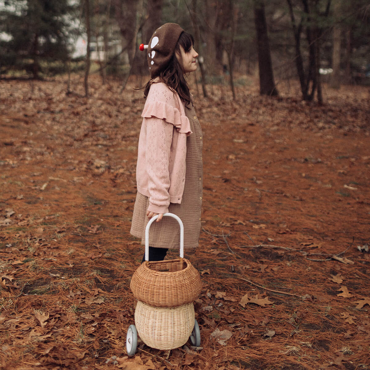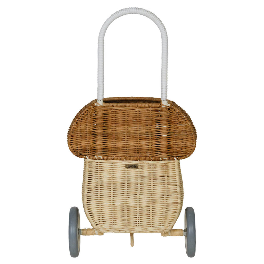 Rattan mushroom luggy basket by Olli Ella. Meet our whimsical Mushroom Luggy in two toned Natural. It exists in the world between practical and fairytale and is perfect for lugging about at home or on the go. Brimming with all the features that make our Classic Original Luggy such a hit, this 100% Handwoven Rattan wheeled basket is ideal for storing and toting around prized possessions! The best bit? The Mushroom Luggy is roomy enough to keep all things precious safely stowed away inside. Mushroom Luggy makes a beautiful addition to any woodland-themed nursery or bedroom and hits just the right notes of vintage x quirky. This Luggy is designed to roam wherever your child may go from the beach to the playground and everywhere in between. This Luggy makes for excellent toy storage when not in use and is terrific for carting and adventuring with Dinkum Doll and Holdie Folk friends too.