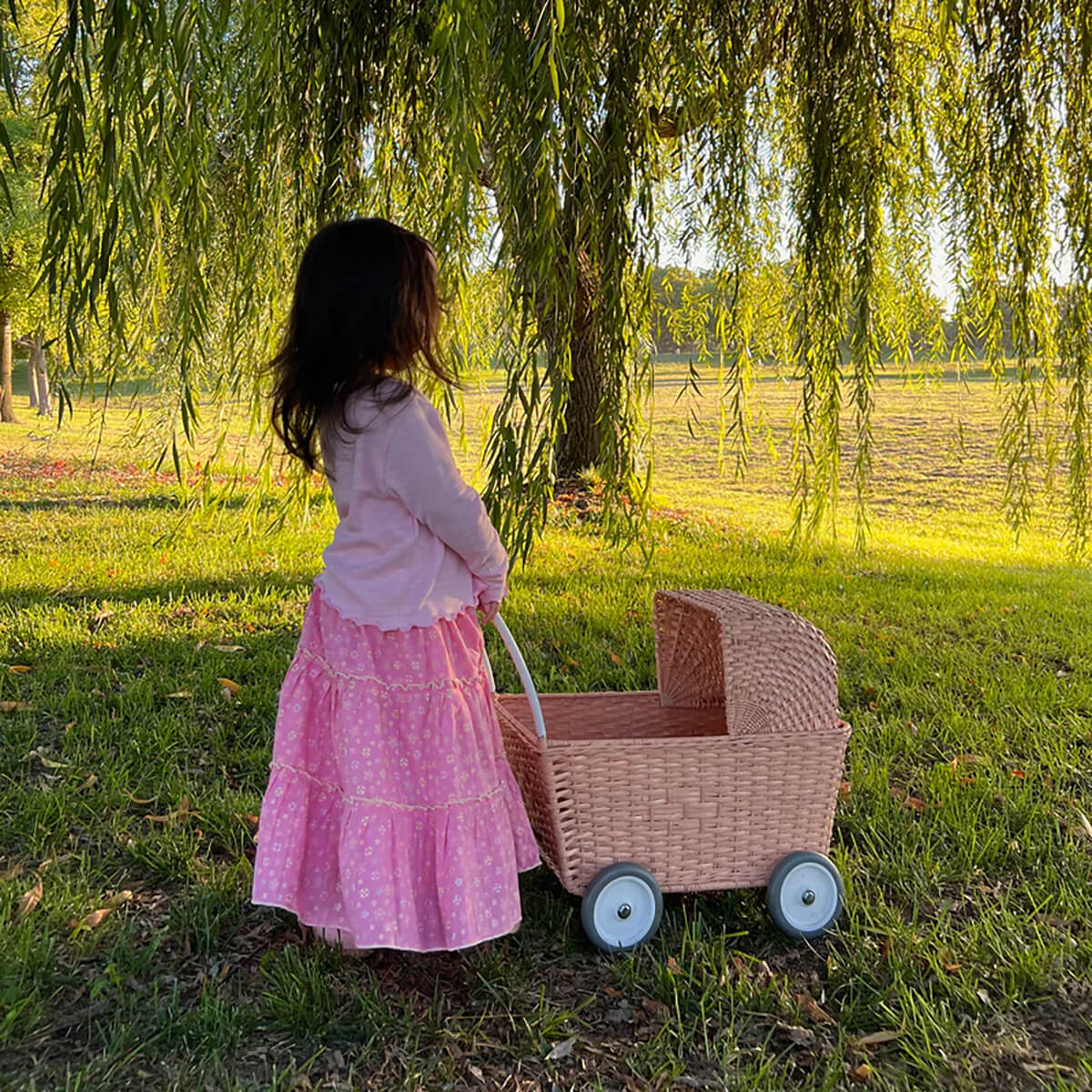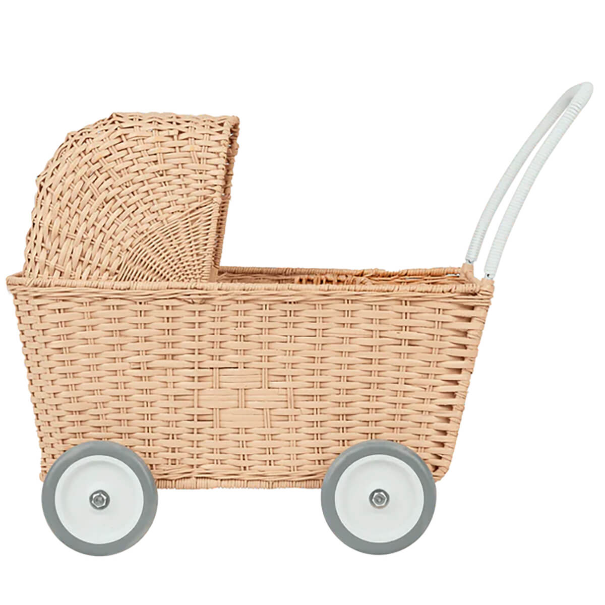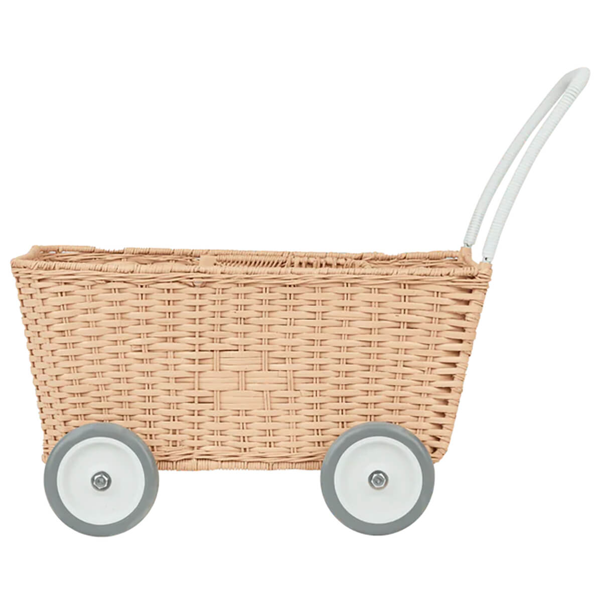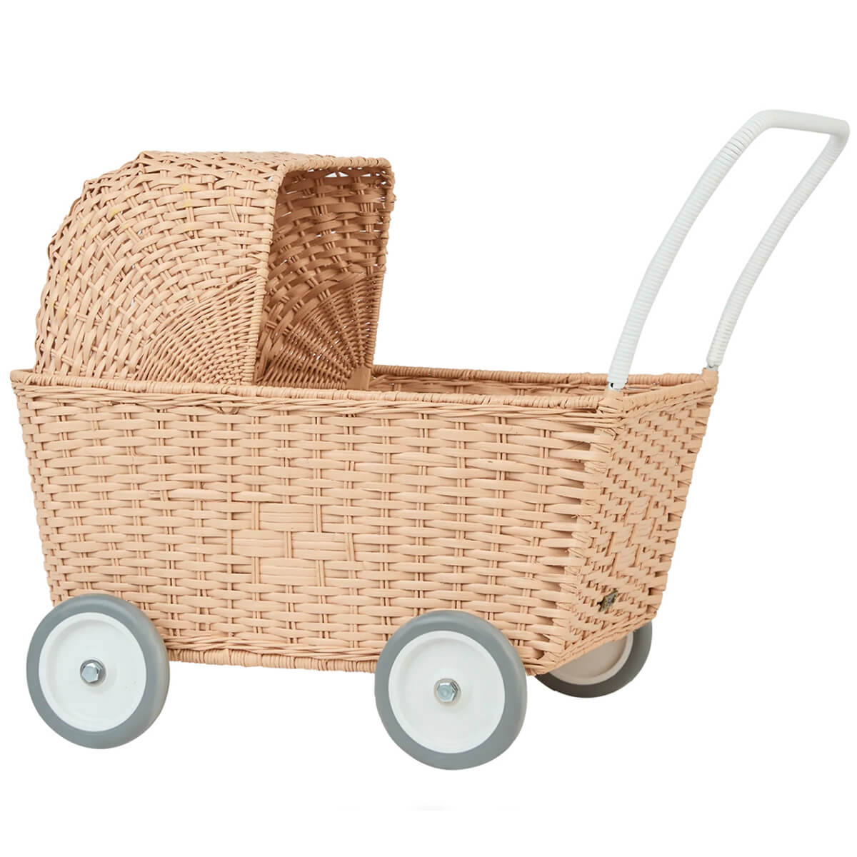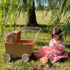 Rattan strolley by Olli Ella. A different kind of convertible, one that goes from being a pram / buggy / stroller to a trolley with just a flip of a lid. Strolley is a revolutionary design in imaginative play. This hand-woven rattan basket on wheels switches from a pram to a shopping trolley, by just lowering the hood of the pram. Perfect for dolls, pretend play, fruits and veggies or for your little one to push around their favourite toys.
