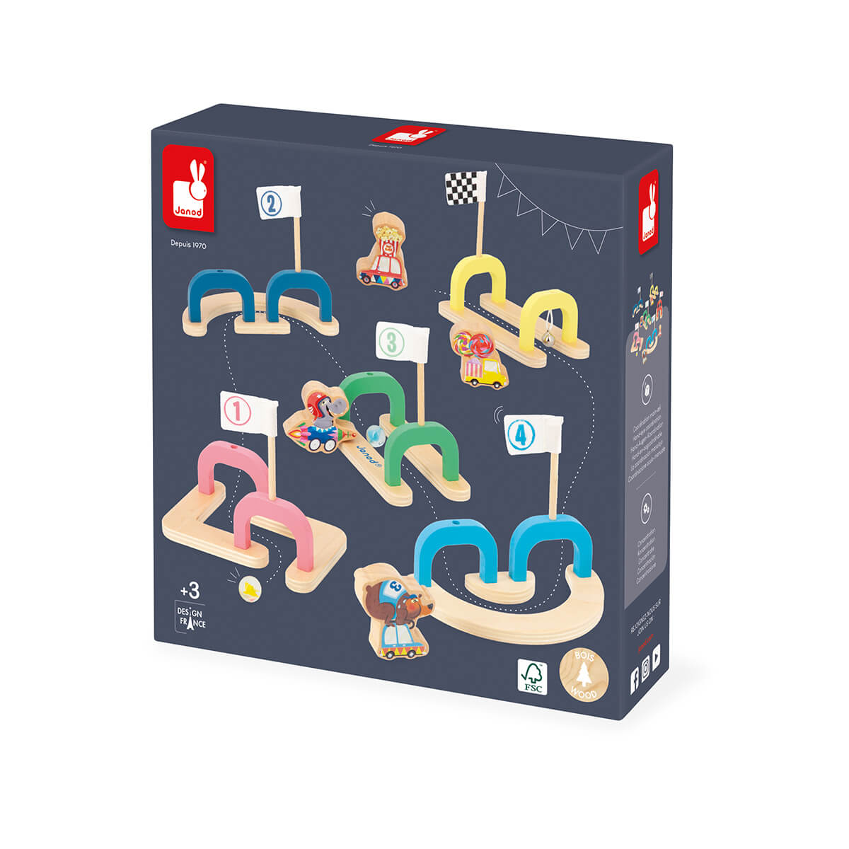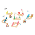 Marble Race by Janod. Make a mad dash towards victory with this wooden marble track. This obstacle course contains: 6 coloured entrances and exits with flags, 2 glass markers and 4 wooden vehicle tokens. The aim of the game: to be the first to reach the finish line by flicking your marble through the numbered tunnels.