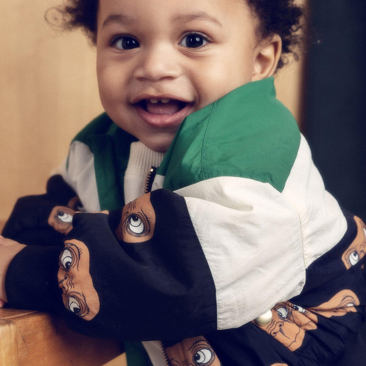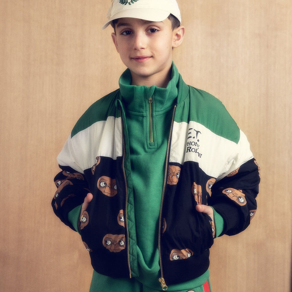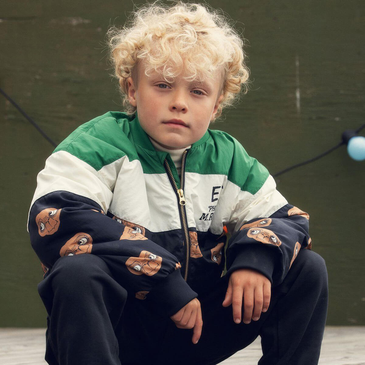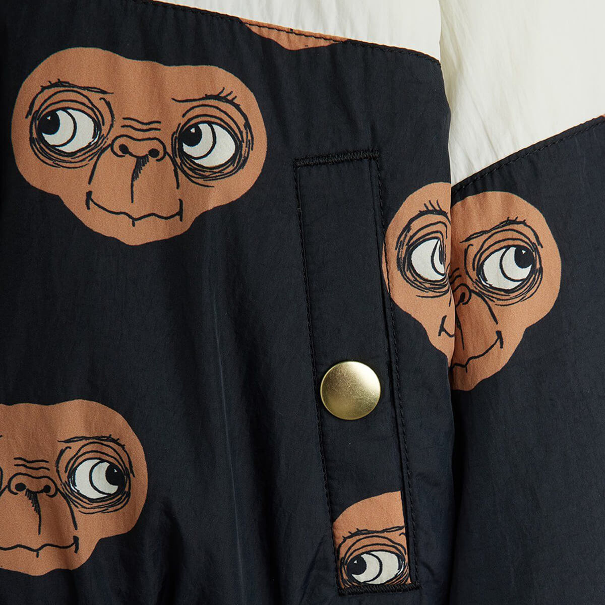 E.T. Baseball Jacket by Mini Rodini. Colour-block baseball jacket made from 100% recycled nylon with E.T. print. Features elasticated cuffs and bottom hem and two front pockets.