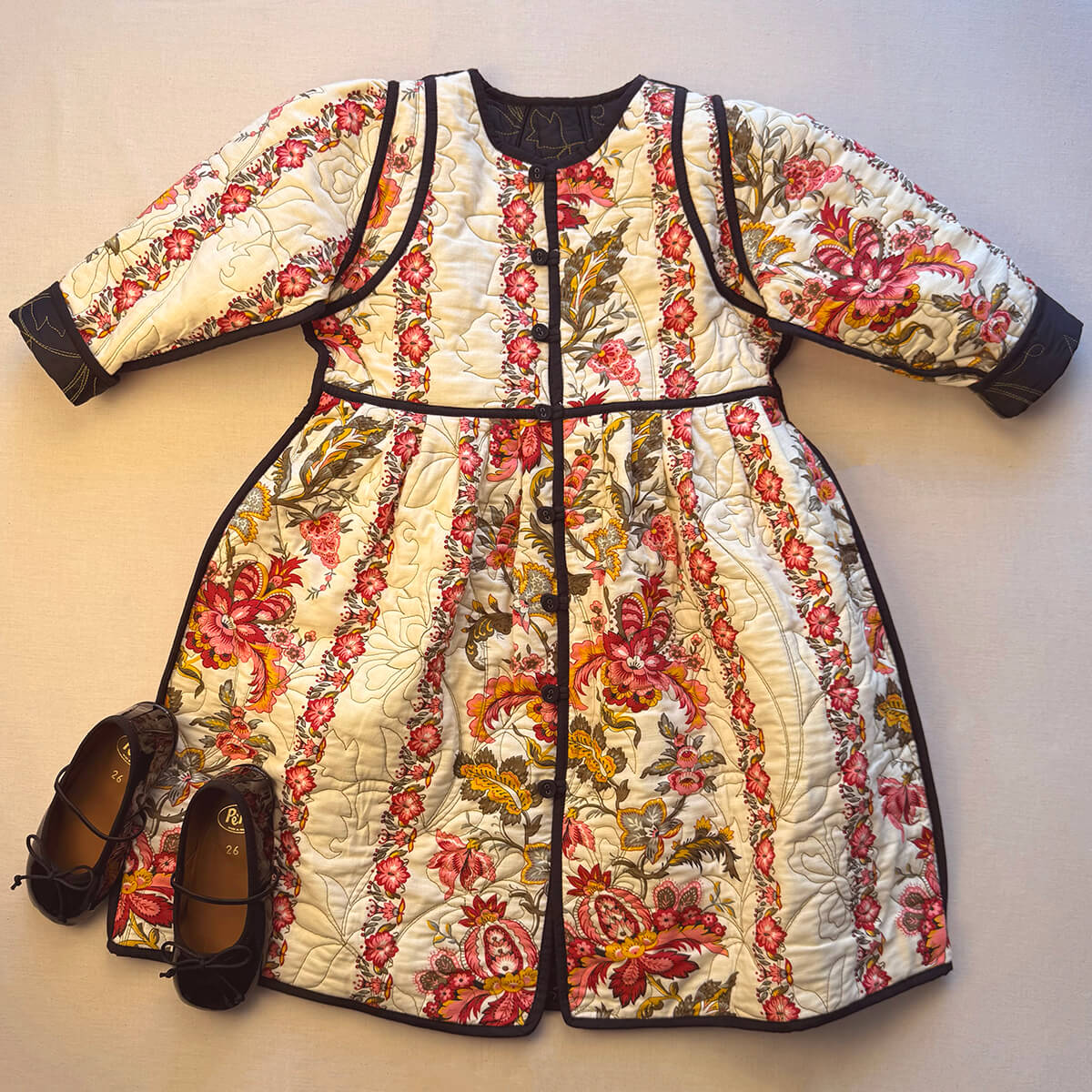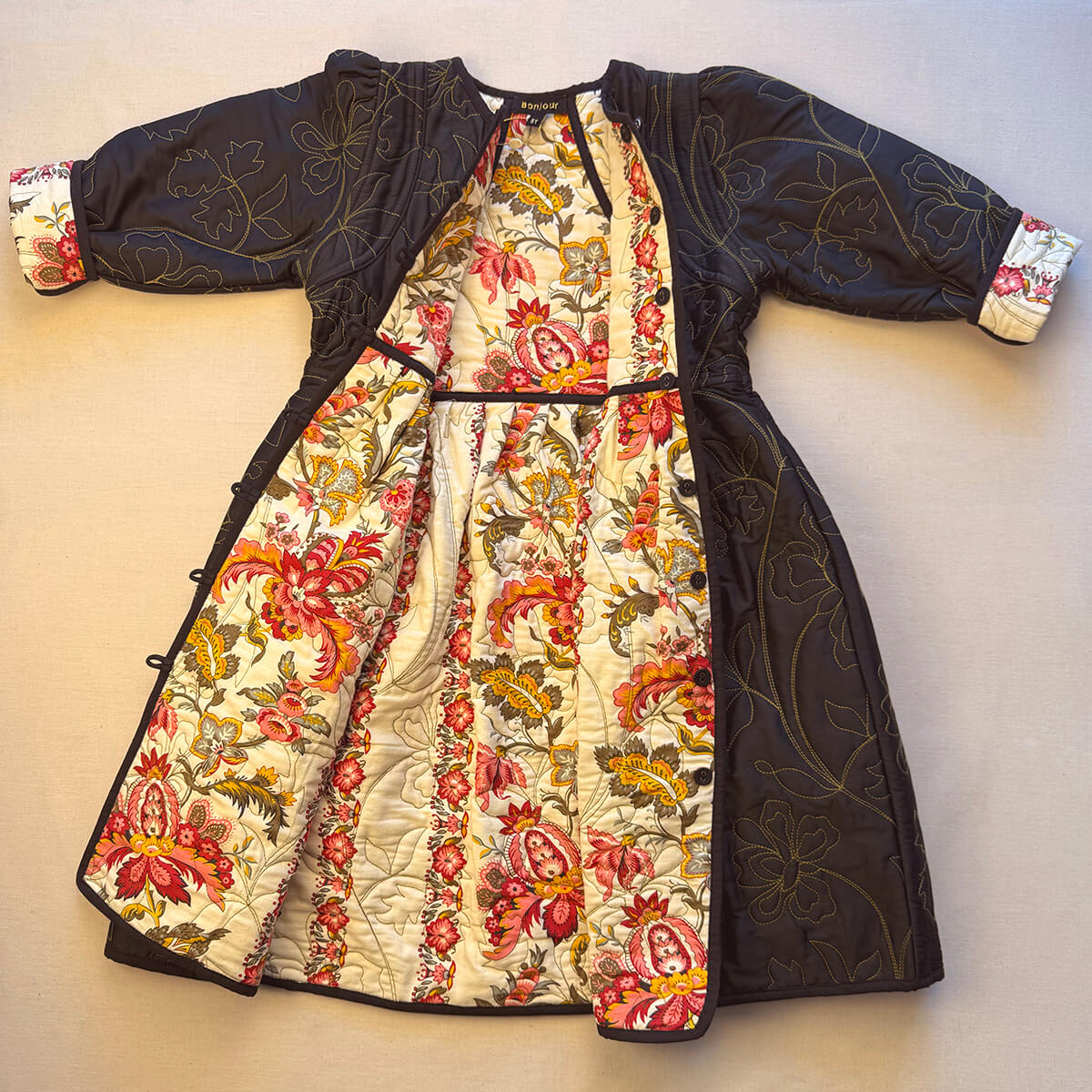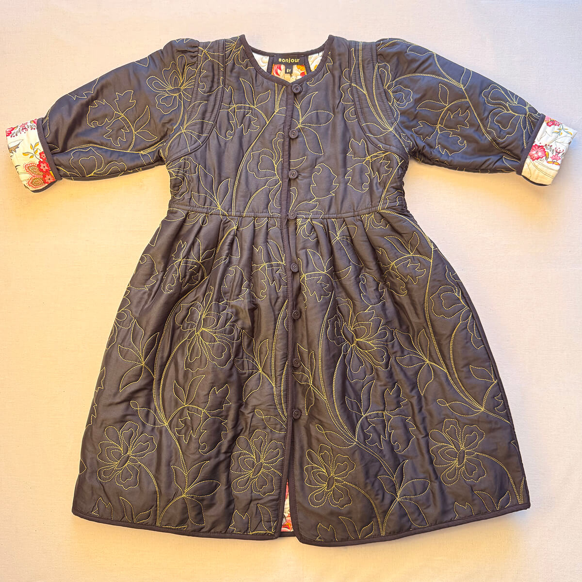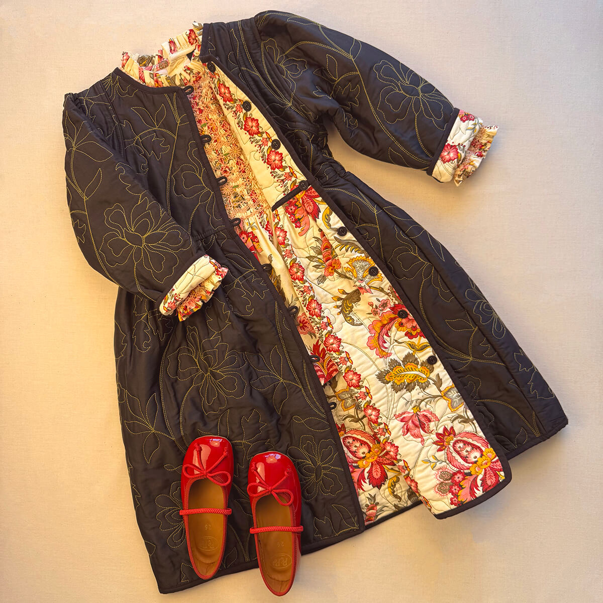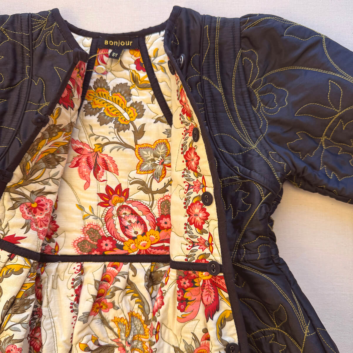 JUNIOR EDITION EXCLUSIVE Dress Coat by Bonjour. Taffeta reversible coat in black with a jacqueline flower lining. A stunning long length jacket with over-stitched quilting in a beautiful flower pattern. Fully reversible.