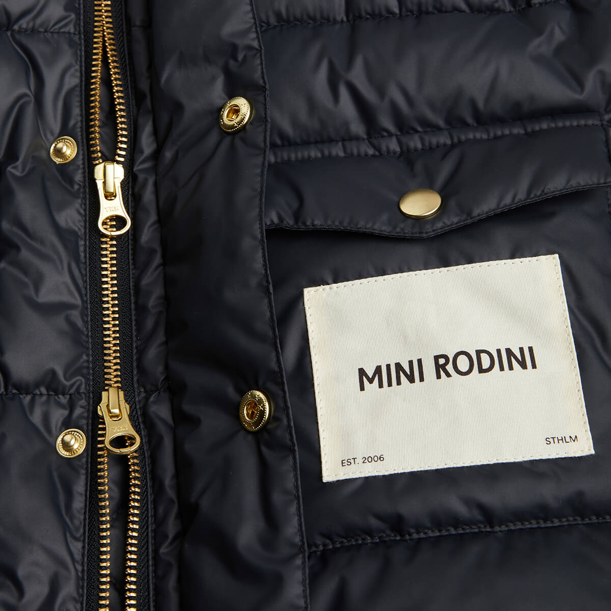 Heavy hooded puffer jacket by Mini Rodini. A heavily padded windproof coat with a removable hood. Featured side pockets and placket covered zip and snap buttons at placket for extra protection.