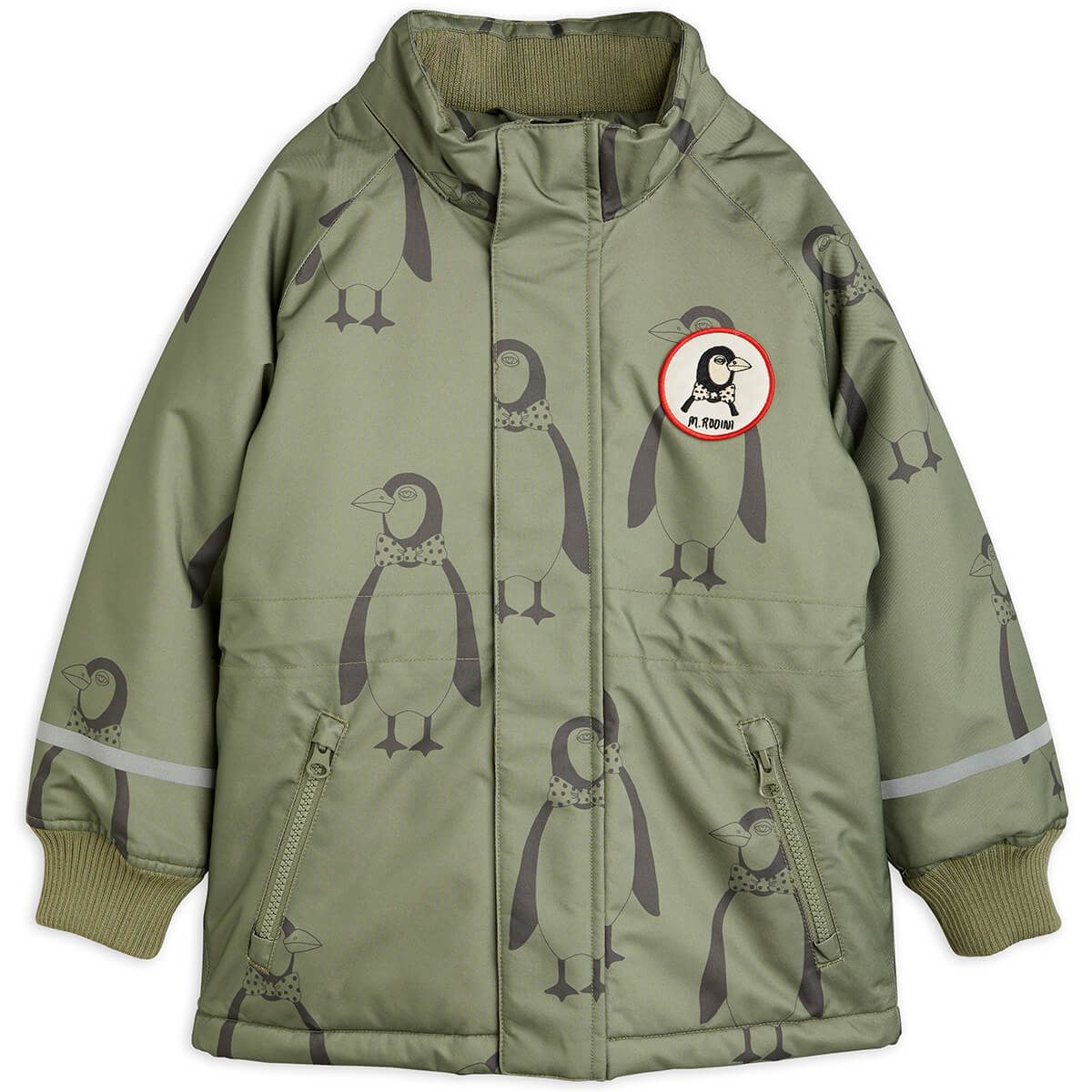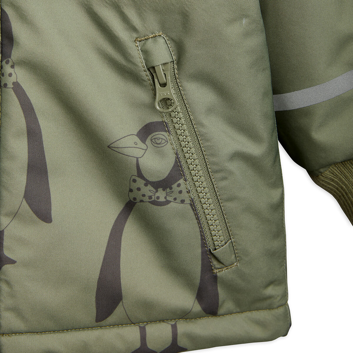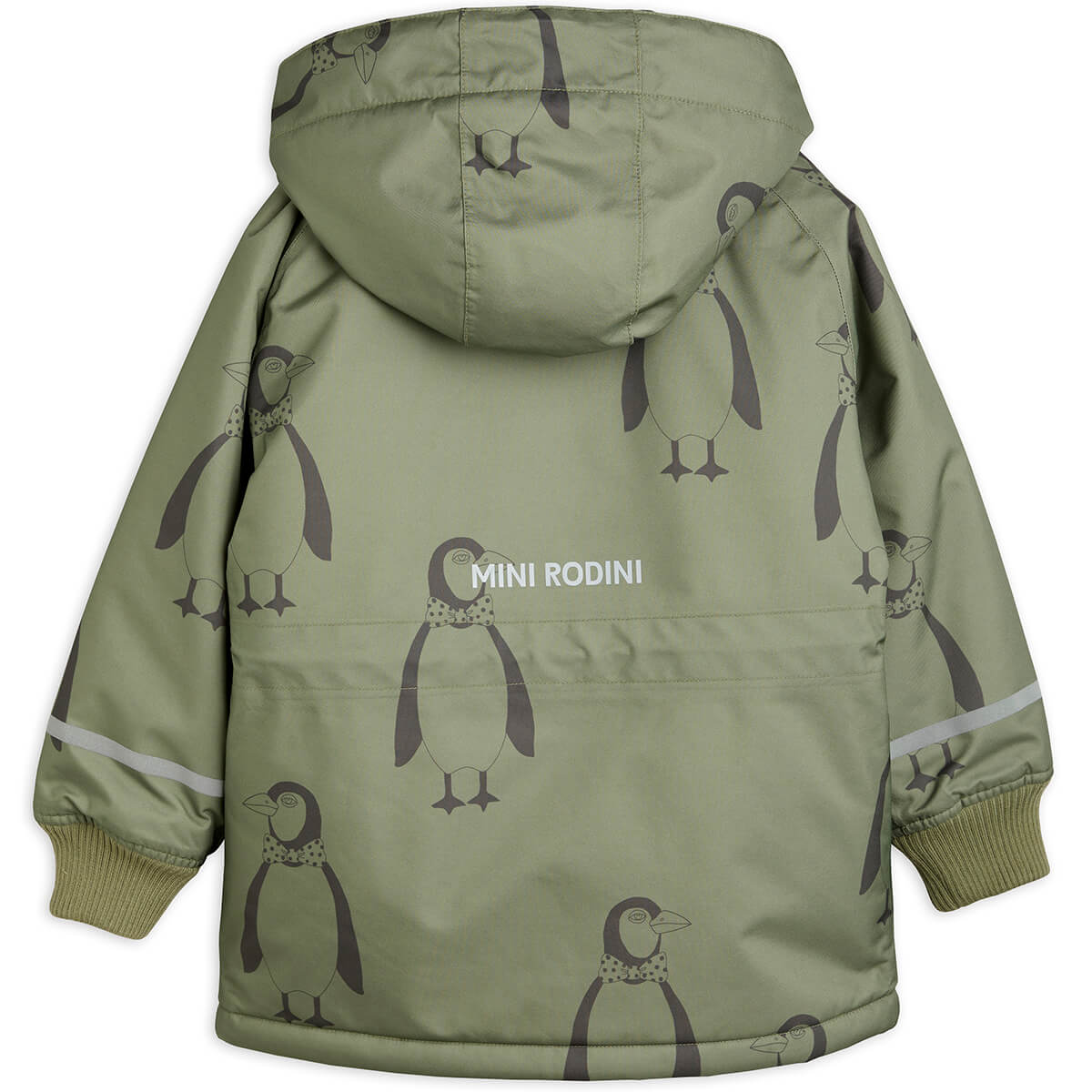 K2 Parka jacket by Mini Rodini. Green padded winter jacket featuring an all over Penguin print, made from 100% recycled polyester. The jacket is designed with a removable hood with faux fur and lining in polyester satin and is adorned with a large penguin patch on the chest. It’s made of a functional and heavy-duty shell fabric with taped seams and water repellent BIONIC-FINISH® ECO coating. The soft cuffs at sleeves and inside the collar prevents wind and snow from getting in, and the reflectors increase visibility when the days get darker. Remove the hood for a more casual look!