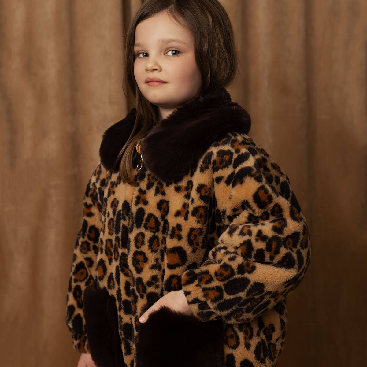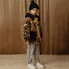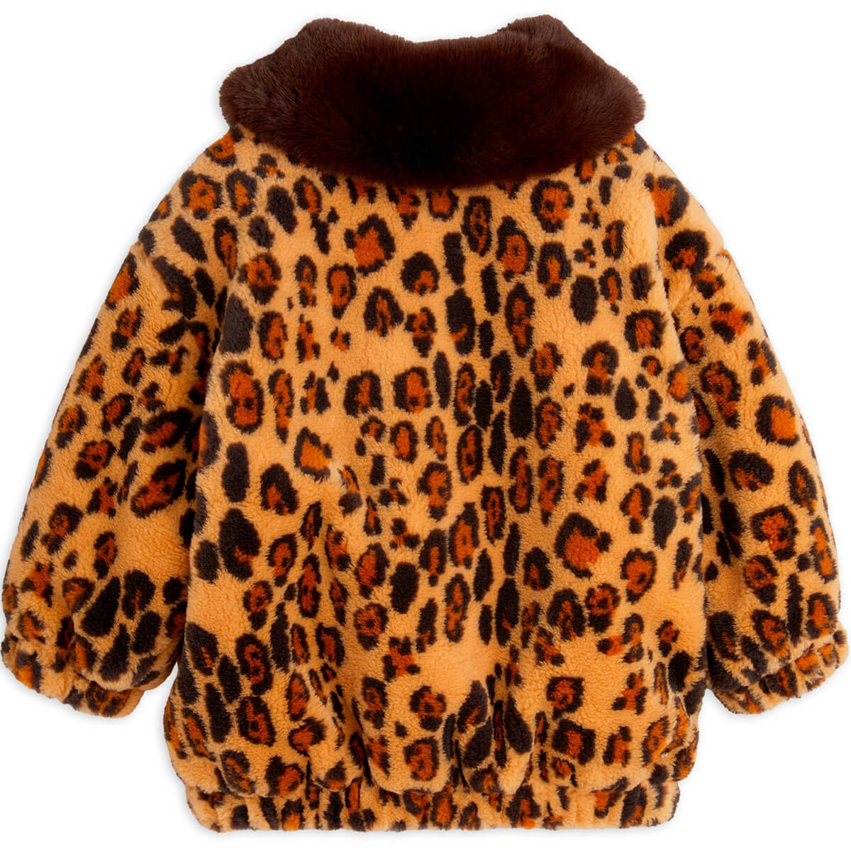 Leopard Faux Fur by Mini Rodini. Faux fur jacket in a leopard print with contrasting collar and polysatin lining. With two front pockets, drop shoulders and elastic trims.