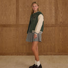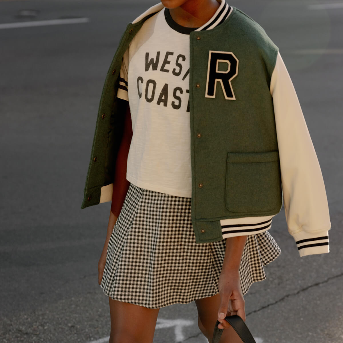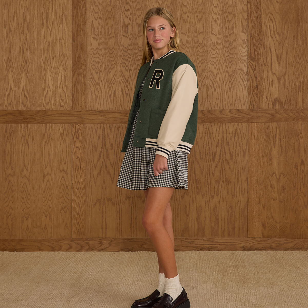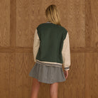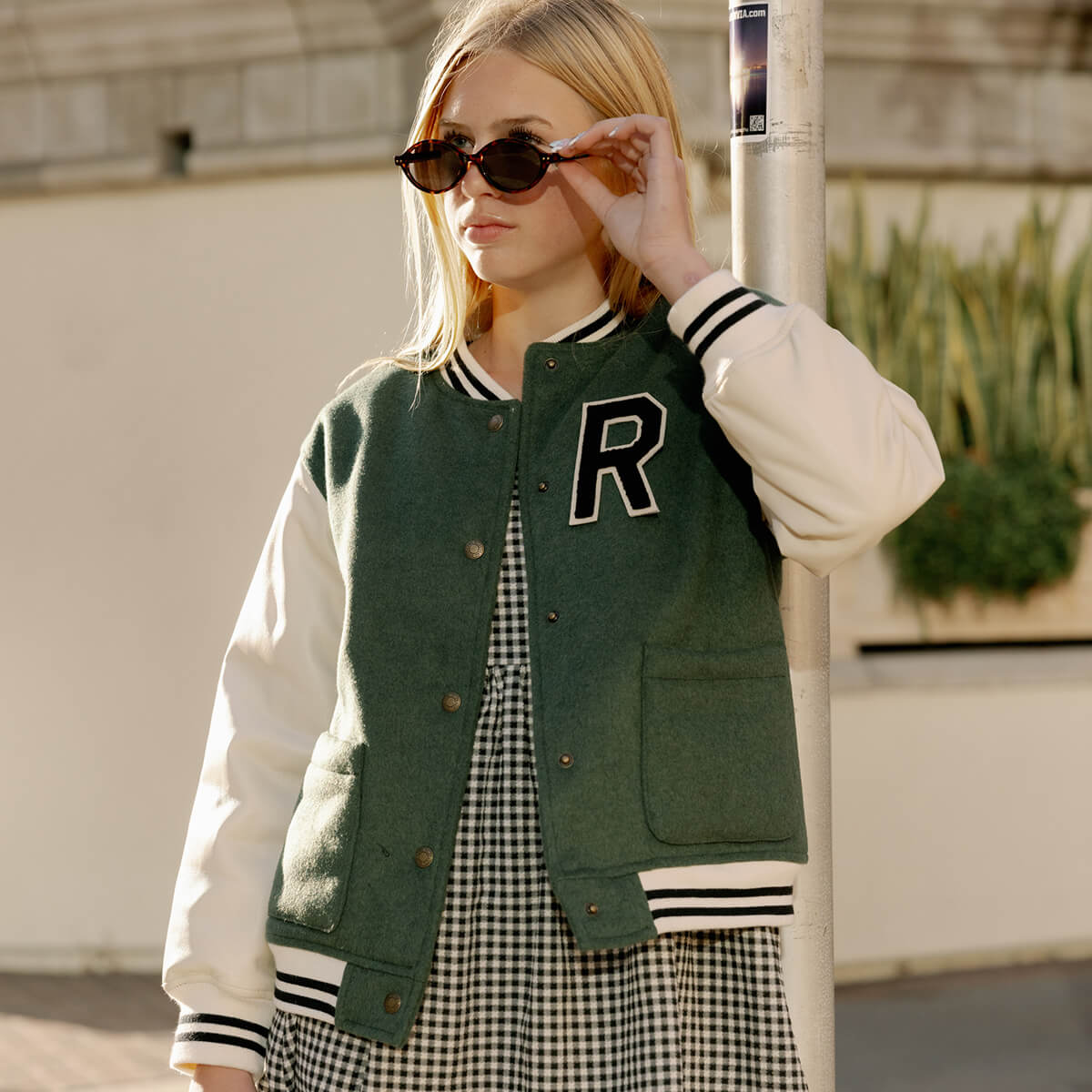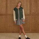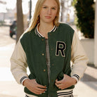 Teen Varsity Jacket by Rylee & Cru. This green varsity jacket brings all the vintage prep vibes, with striped ribbing at the cuffs and hem, coated metal snaps, side pockets, and a soft cotton lining - this style is sure to hit a home run.