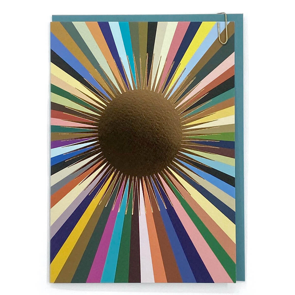 Sunburst greetings card by Pavilion Cards. Card digitally printed in Radar Glen design on a luxury tinteretto gesso 300gsm board with foiled details. Blank inside with a teal envelope.