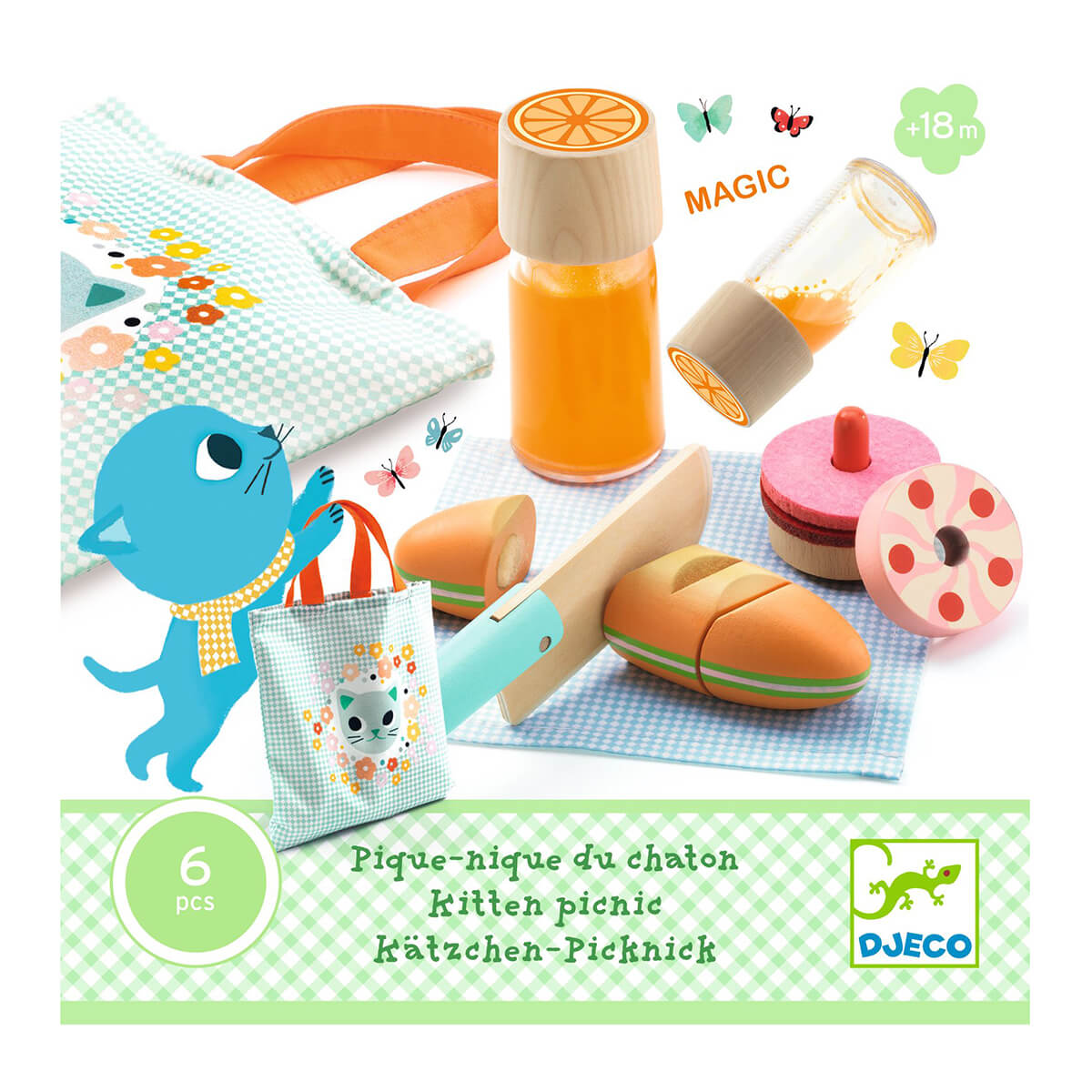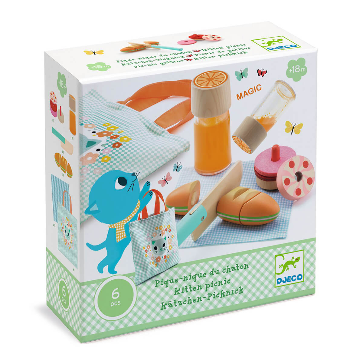 Kittens Picnic Set by Djeco. A pretty tote bag with everything you need to teach your little ones about preparing a delicious picnic. Your child can lay out the tablecloth and prepare their serviette. Now they’re ready to enjoy their picnic as they cut their sandwich and taste their cake. After this lovely meal, nothing could be better than a nice refreshing drink from the magic flask.