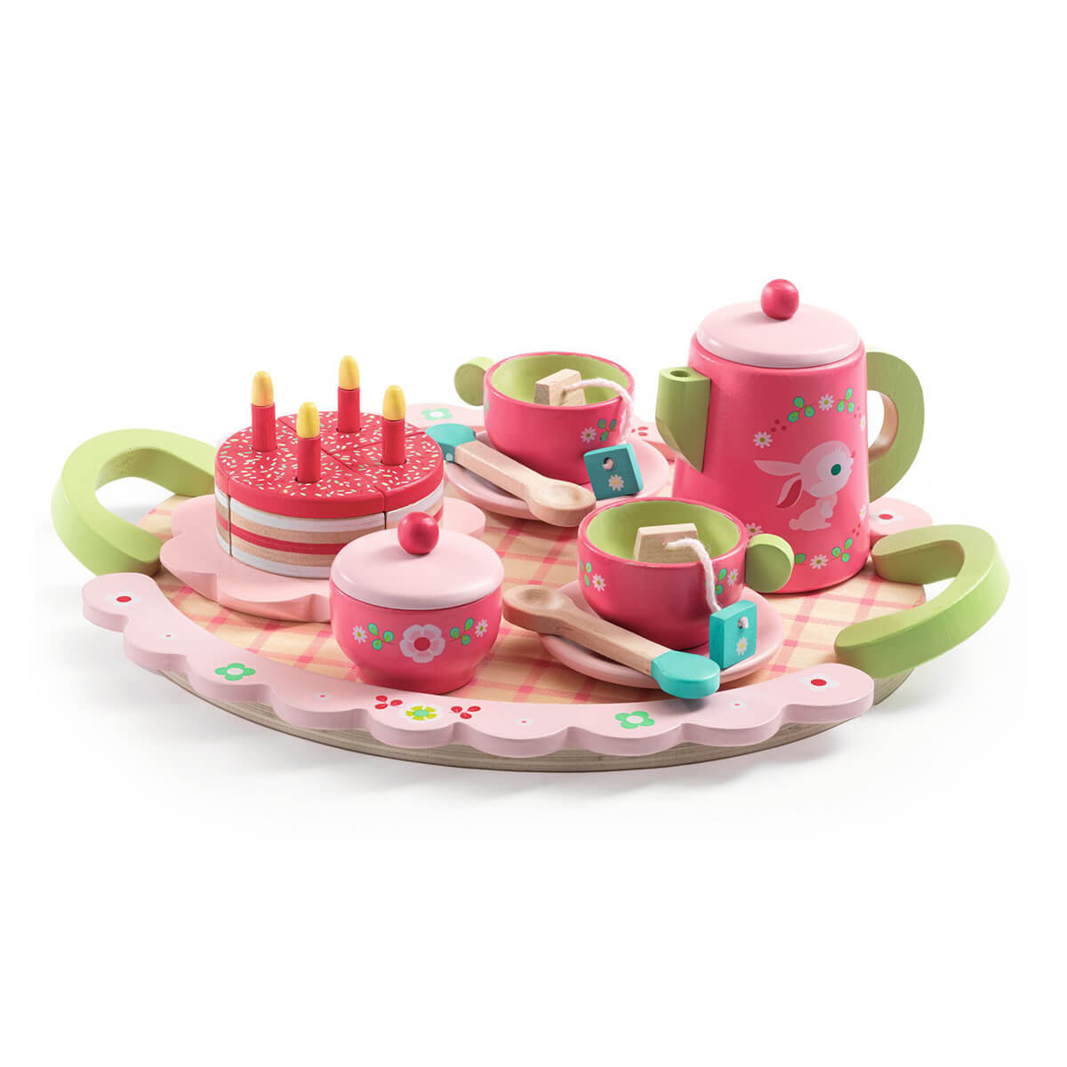 Lili Rose's Tea And Cake Set by Djeco. An adorable wooden playset for celebrating birthdays and having tea with friends. Presented on a wooden tray with two handles for carrying. An imitation game for children to have fun like grown-ups!