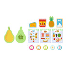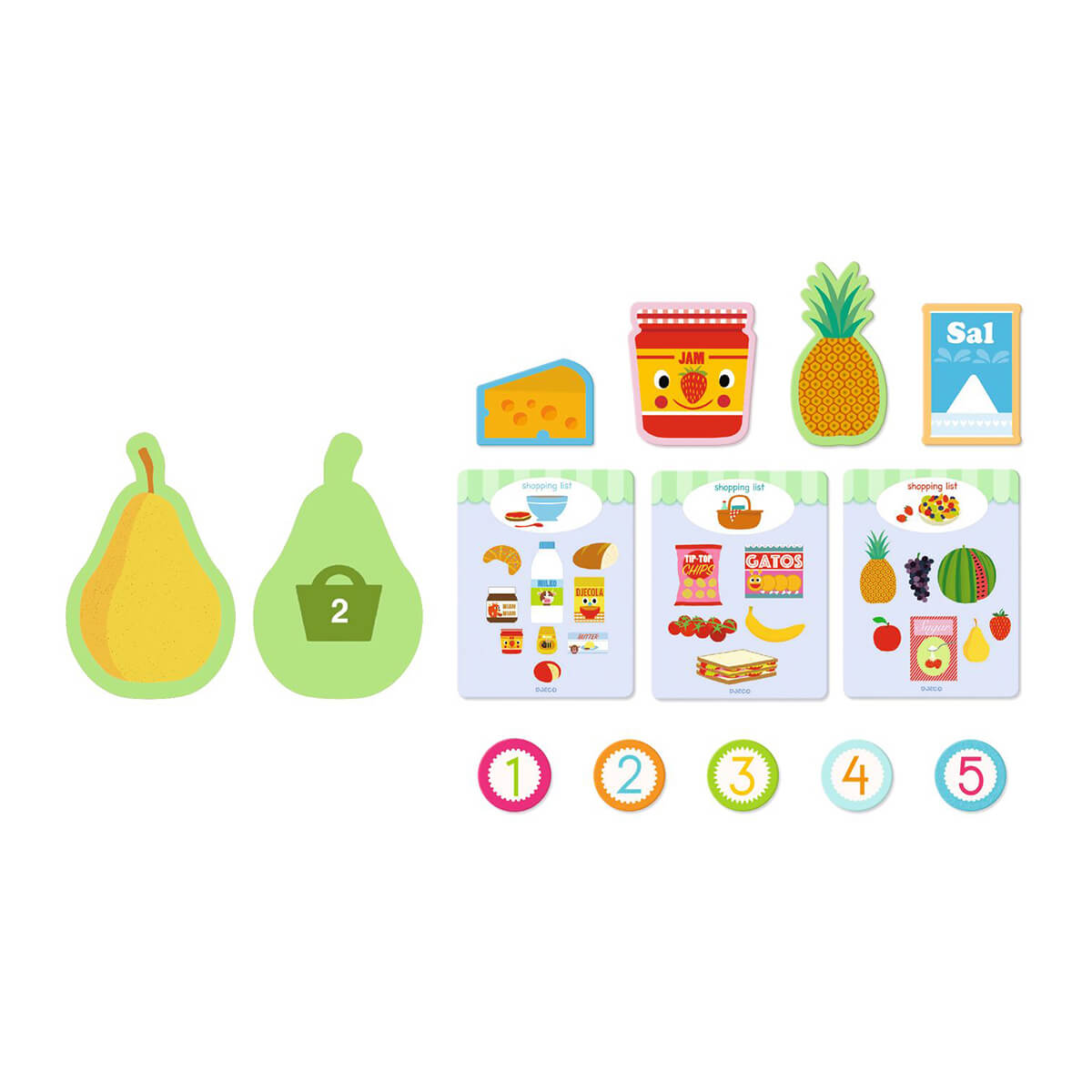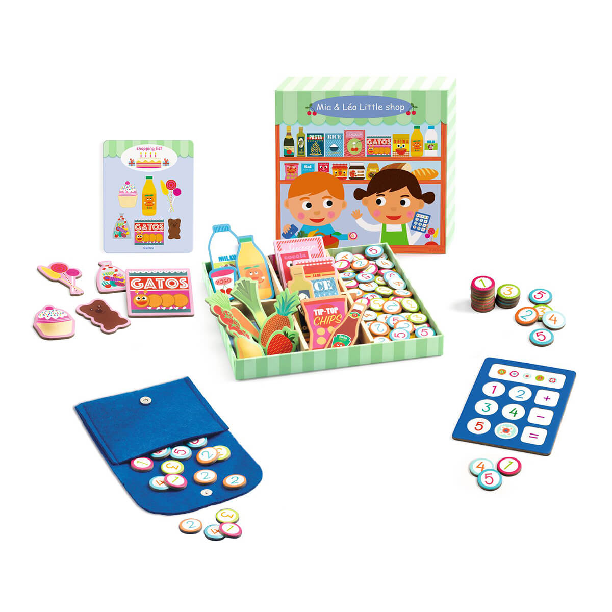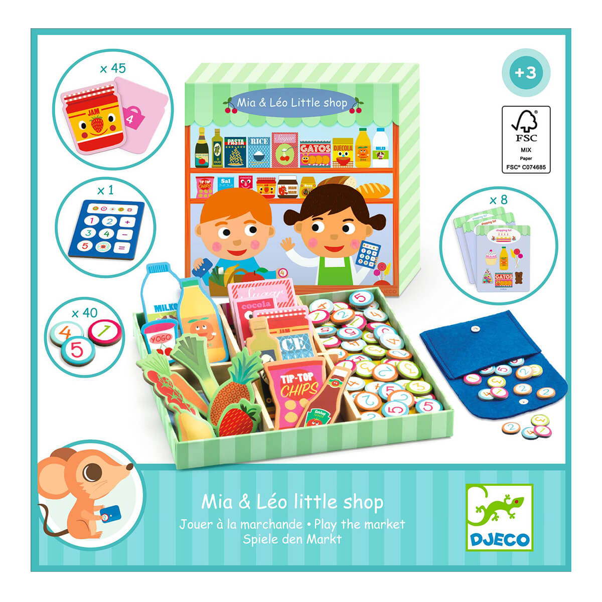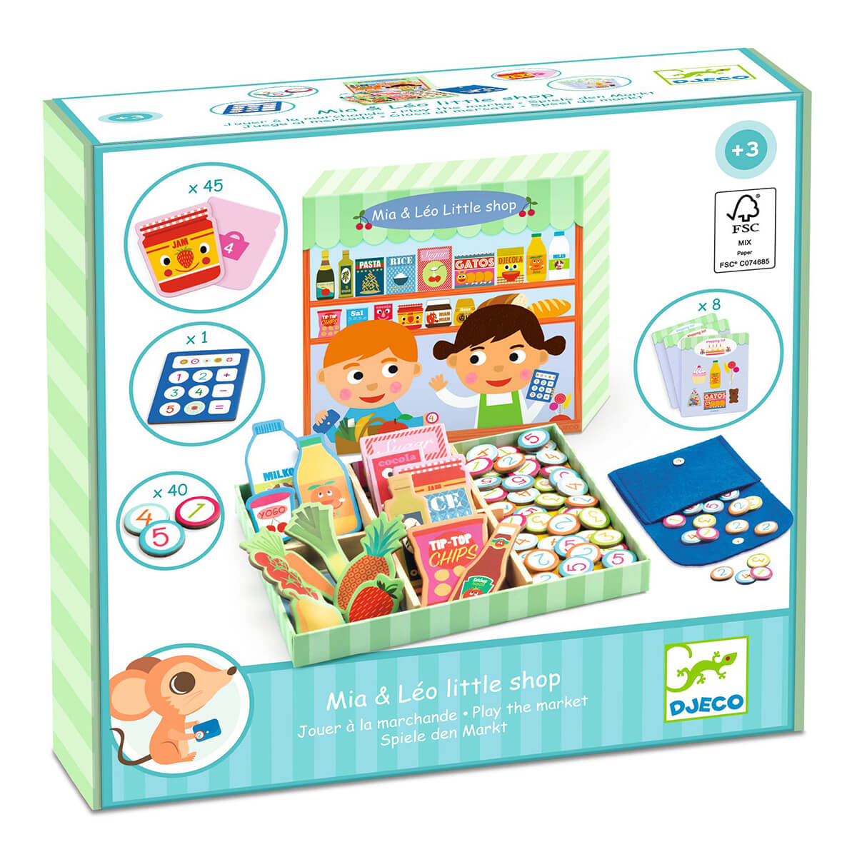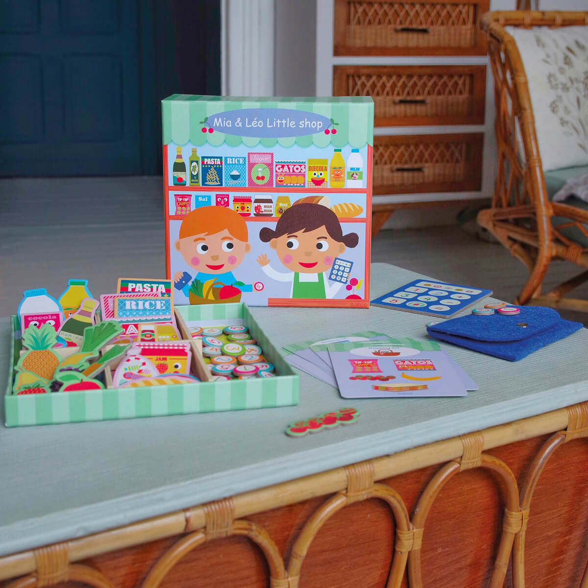 Mia & Léo Little Shop Role Play Set by Djeco. A comprehensive set containing 95 accessories to play shopkeeper. Each person has their role! The shop assistant arranges the food correctly in their stall, works the till and calculates the shopping bill. The customer does their shopping however they wish, or following the themed shopping lists, before going through the till with their wallet.