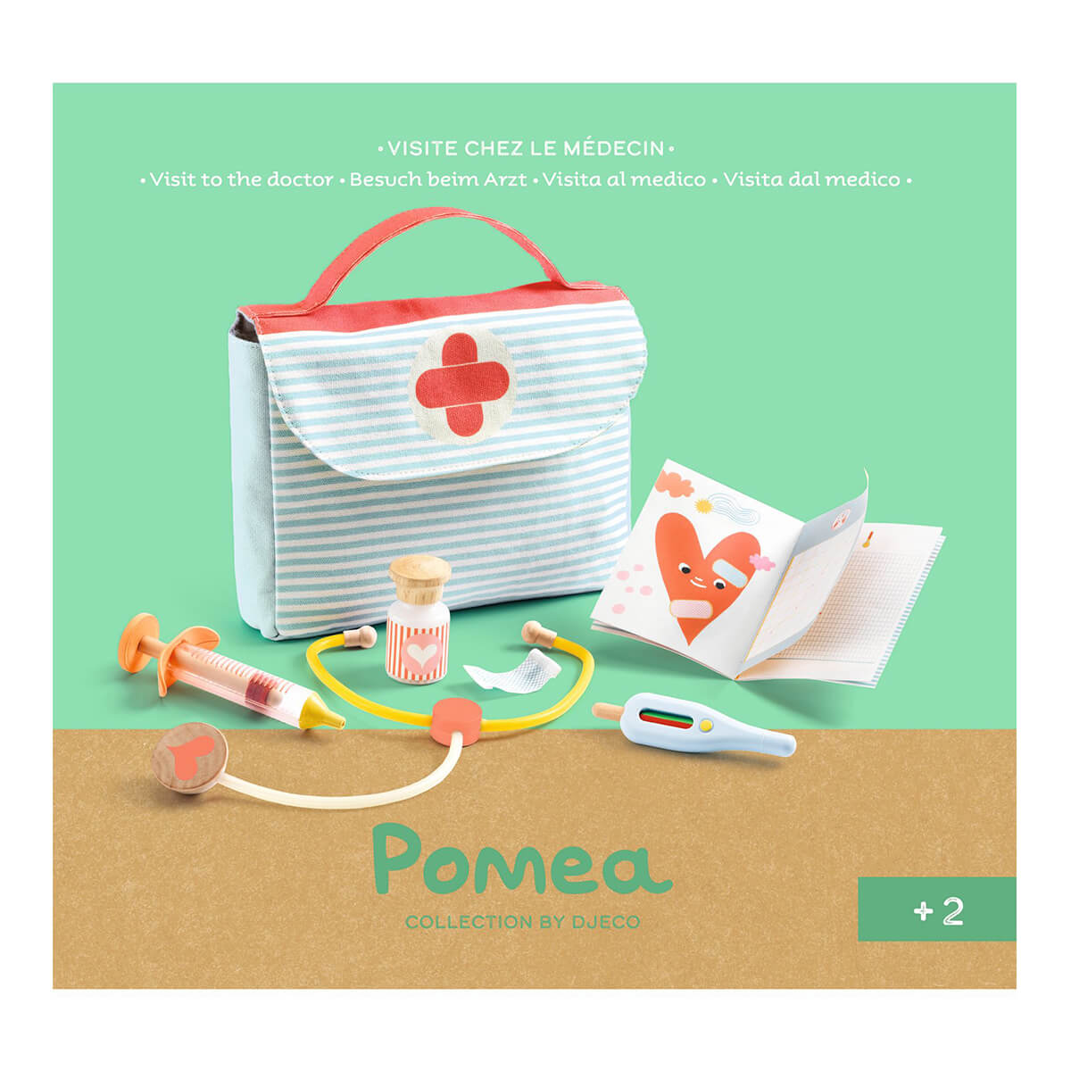 Pomea Visit To The Doctor Role Play Set by Djeco. A doctor’s case that contains all the accessories for playing doctor and taking care of your doll: 1 thermometer, 1 stethoscope, 1 syringe, 1 medicine bottle, 1 bandage and 1 health card.