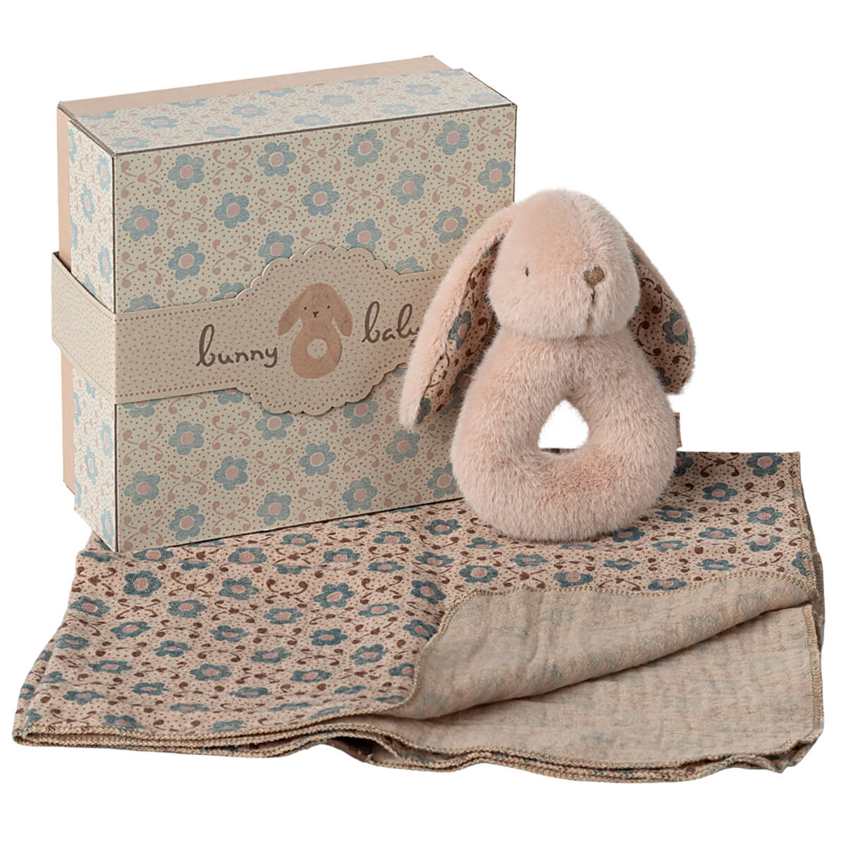 Bunny Rattle Set by Maileg. A perfect gift for new babies. The set includes a soft cotton cuddle cloth and a small bunny rattle. The bunny has a small rattle inside that makes a soft sound. Presented in a beautiful gift box.