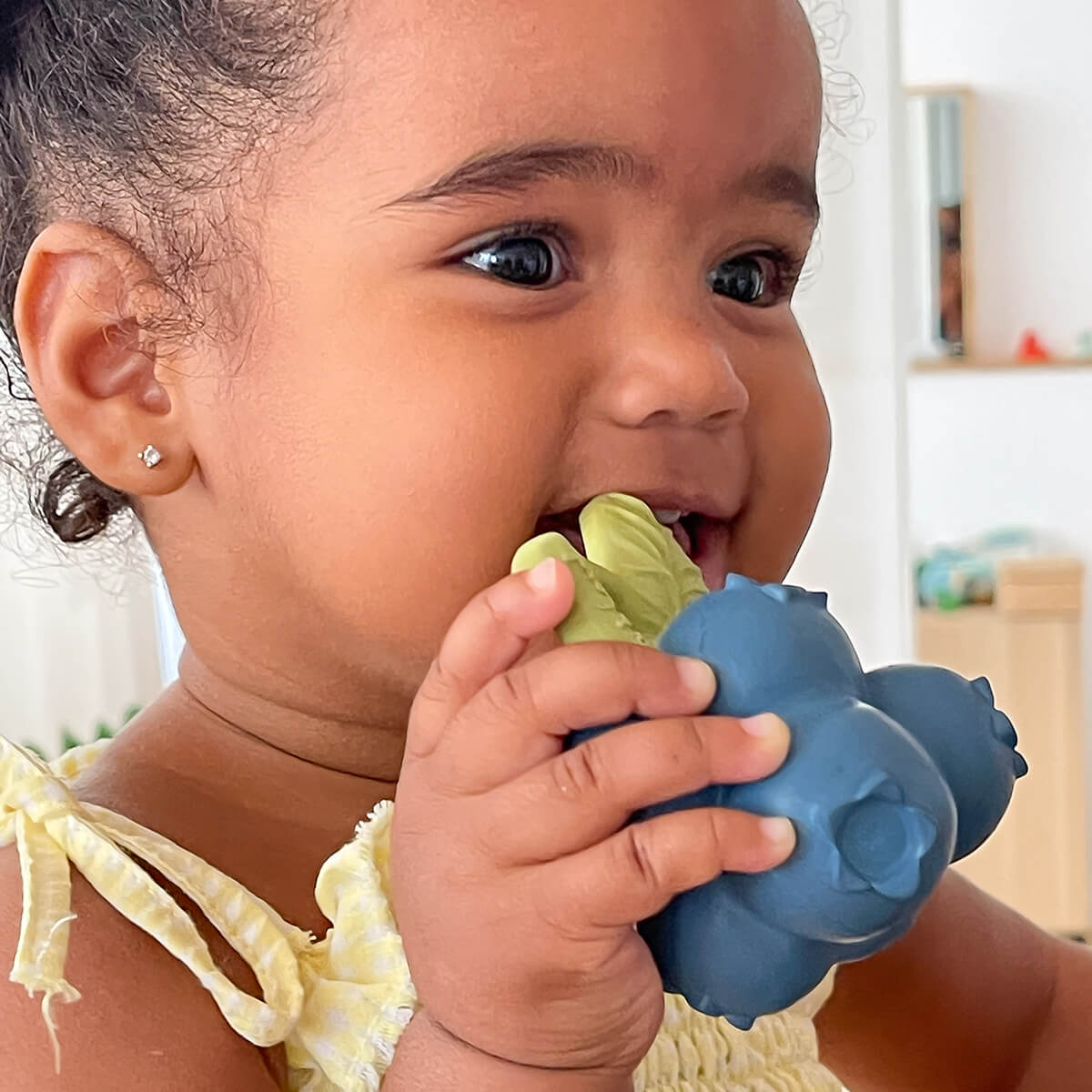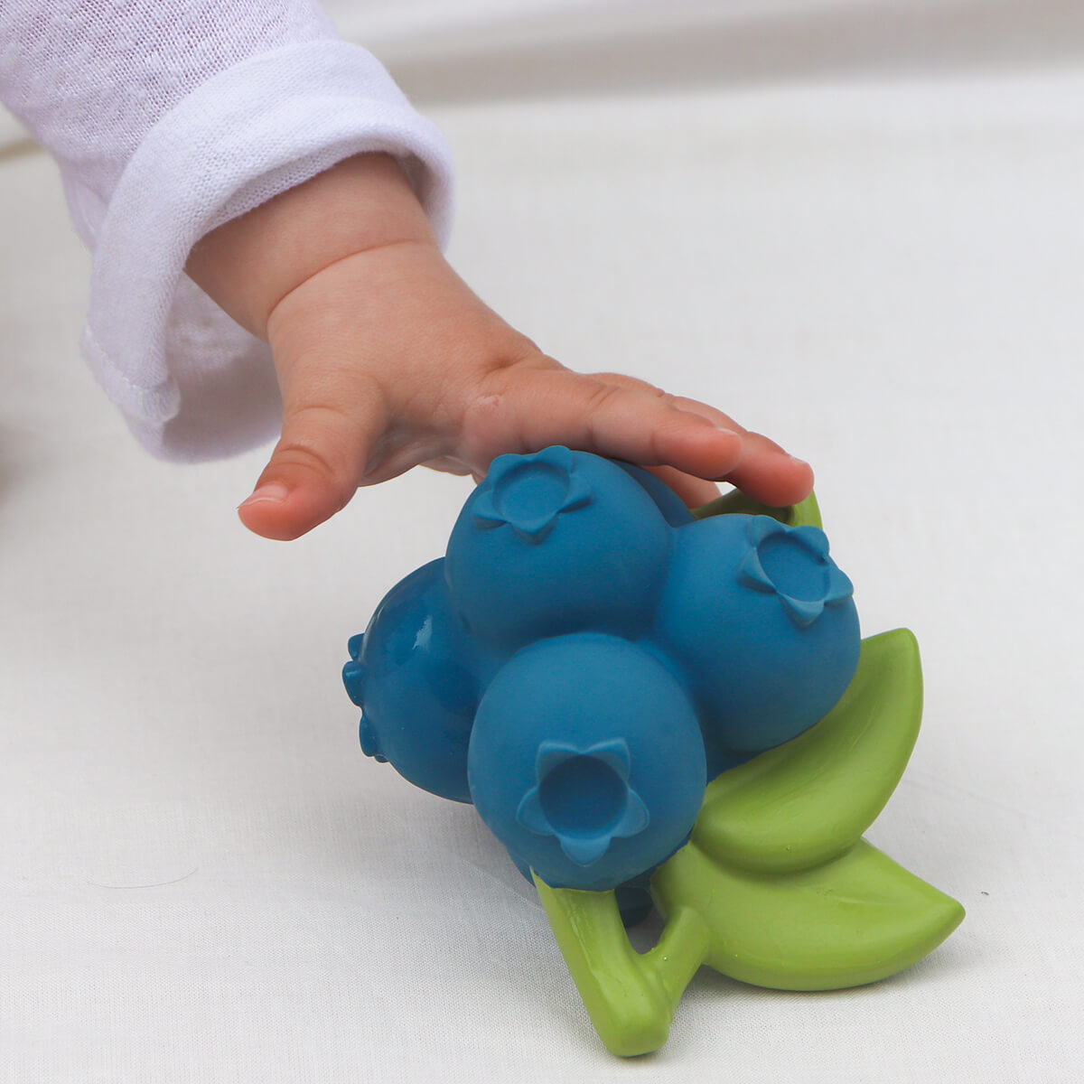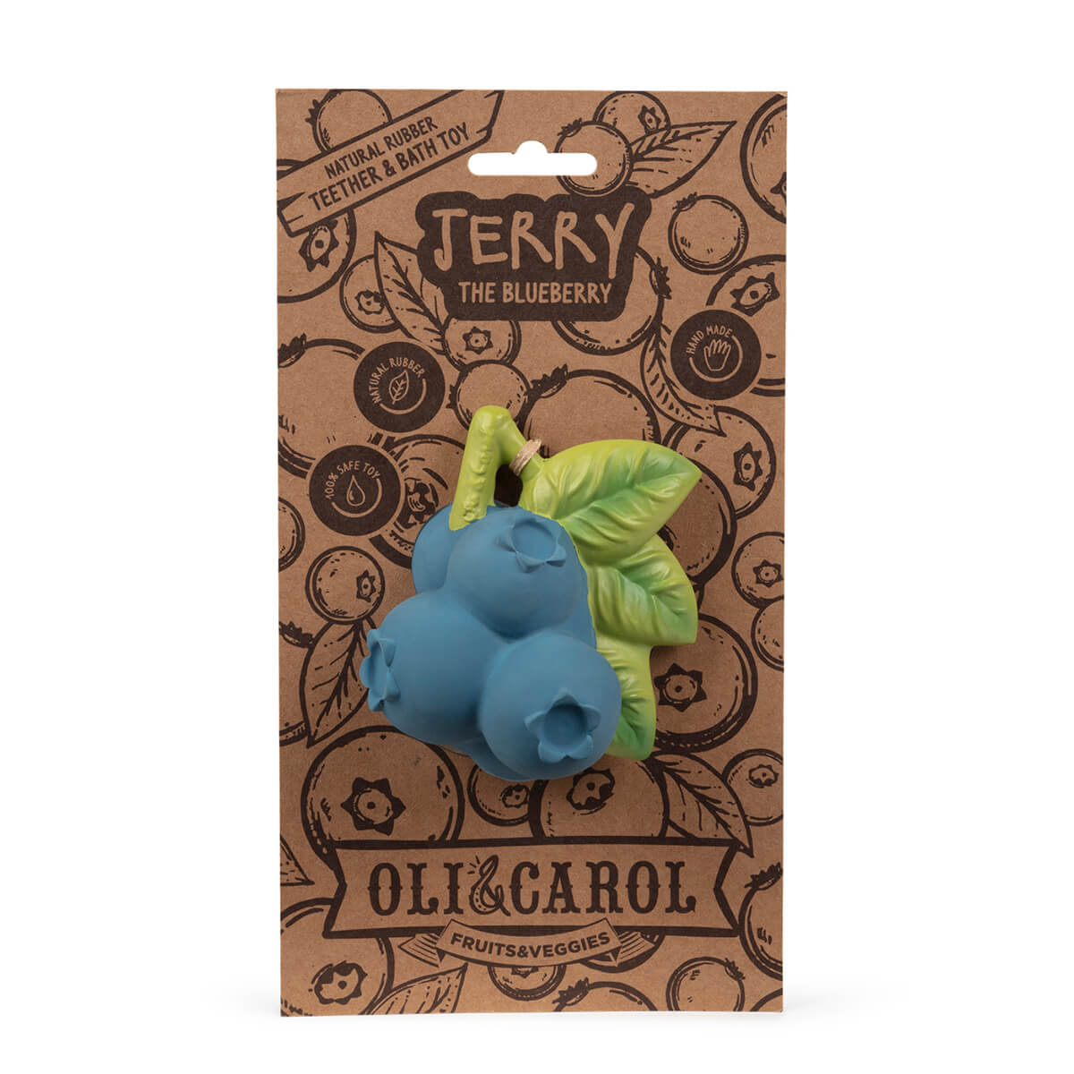 Jerry the Blueberry by Oli & Carol. Jerry the Blueberry is a chewable baby toy for teething, bath time and sensory play. Little ones love its round & squishy shape to grasp and soothe teething gums. Its design with a hole in the middle makes it perfect to hang from a strap & take it everywhere you go! - Healthy tip: Did you know that blueberries help us improve our memory? Introduce your little ones into nature & fruits that surround them!