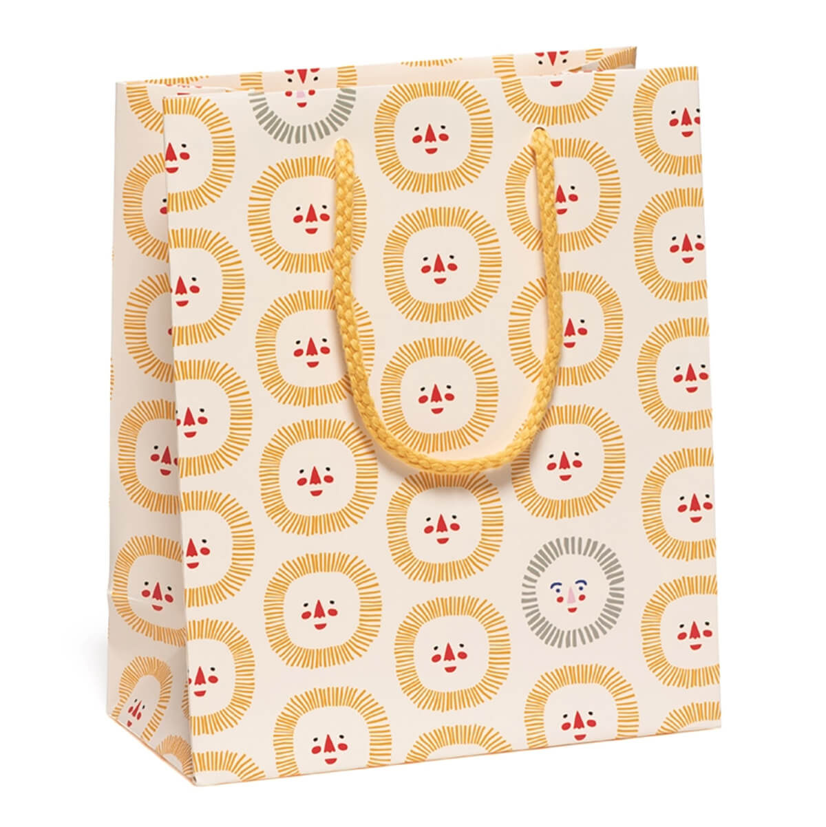 Sunshine smiles medium gift bag by Red Cap Cards. Features an illustration by Stewart Francis Easton. Made from heavyweight coated paper and finished with a cotton rope handle. The perfect gift bag for a small gift. Easily fits in an item of clothing, medium toy, book or similar gift. Printed in the USA.