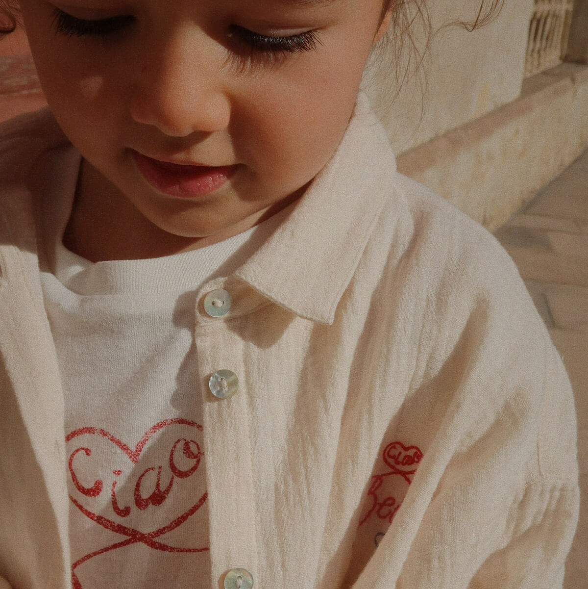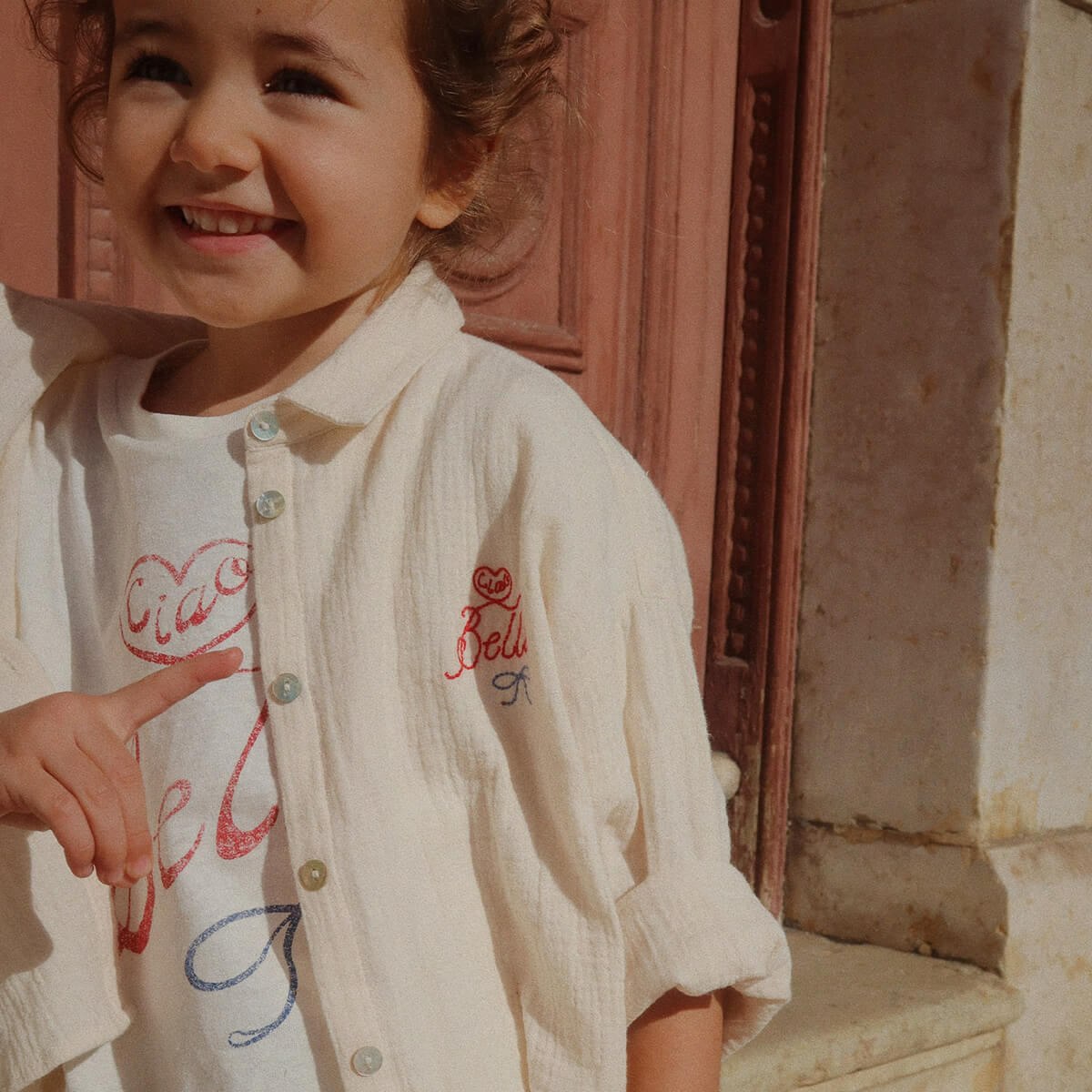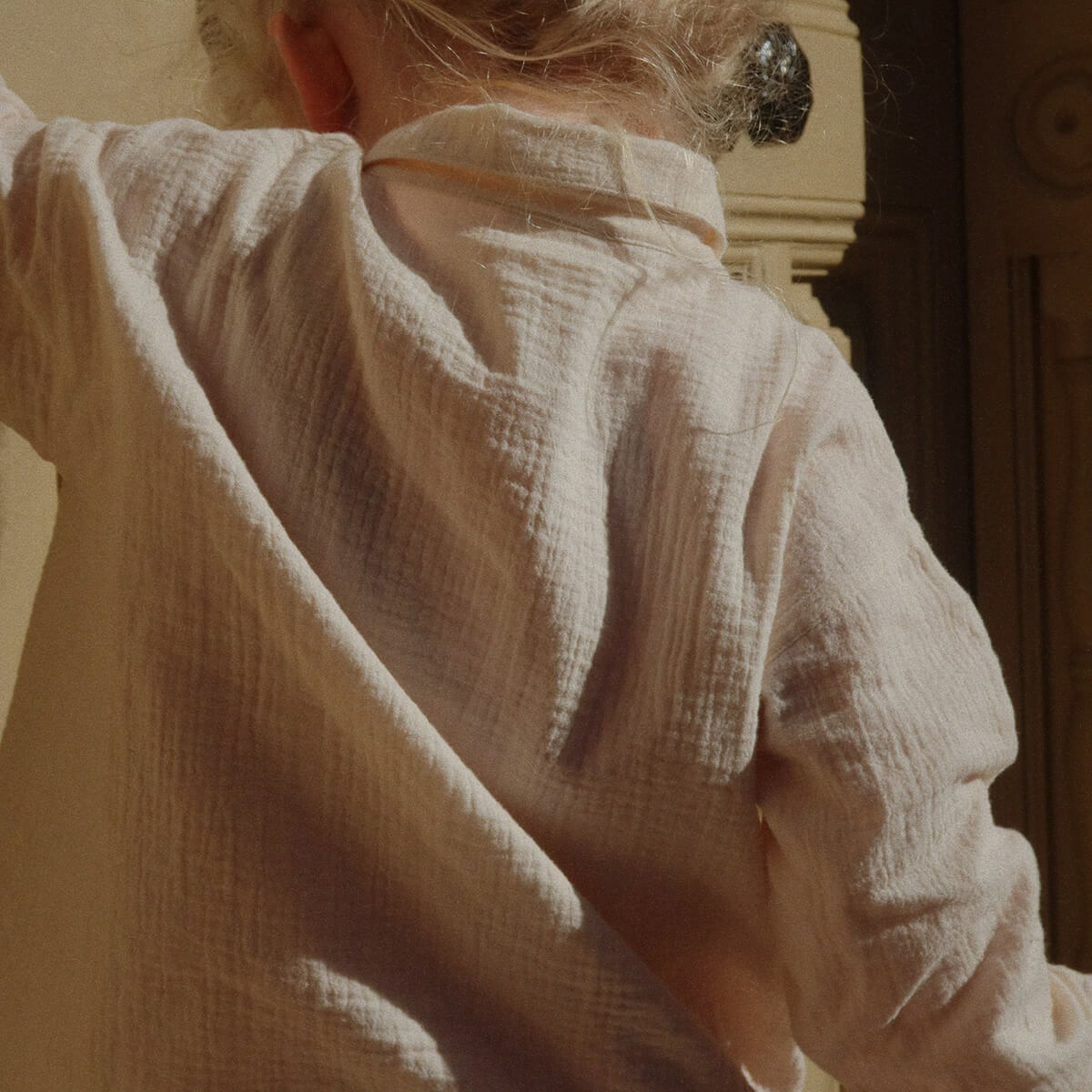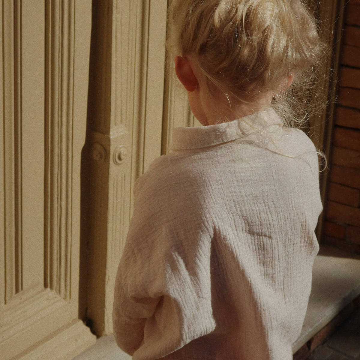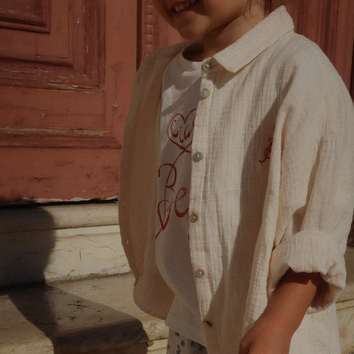 Bella Shirt by Rosie Huntington-Whiteley x Konges Sløjd. The Bella Shirt is a classic piece crafted in light organic cotton muslin with dropped shoulders for a relaxed look and feel.