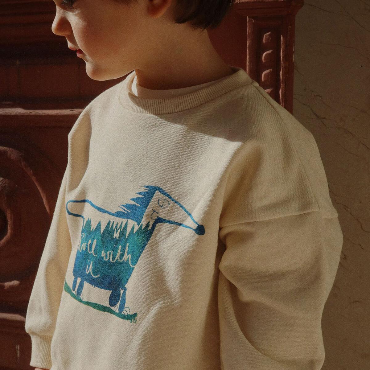 Roller Sweatshirt by Rosie Huntington-Whiteley x Konges Sløjd. Soft sweater made in organic cotton with a relaxed fit. Designed with dropped shoulders and a slightly boxy fit, and finished with a cute sausage dog illustration in front made by Rosie's son, Jack.