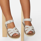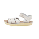 Swimmer sandals by Salt-Water. The Swimmer design is based on the original Salt-Water featuring a plaited leather upper with buckle ankle strap. The differences are the Swimmer has a slightly narrower fitting and, like all Sun-San Sandals, the Swimmer comes on a spongy urethane sole with rust proof buckles. They can be worn in the water and can be hand washed with a gentle detergent.