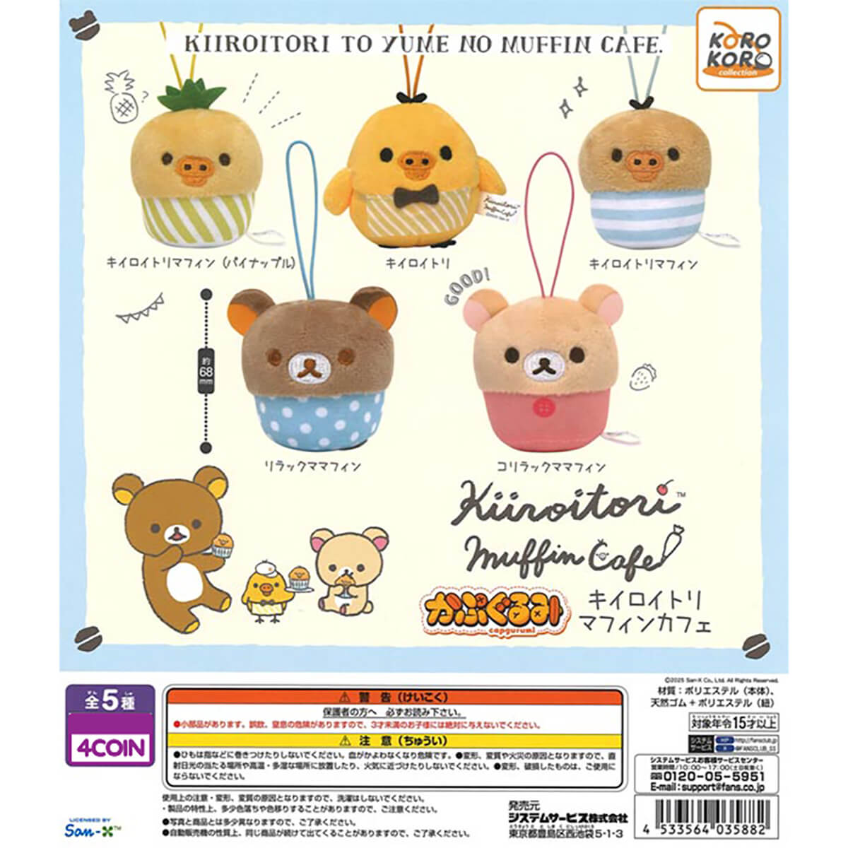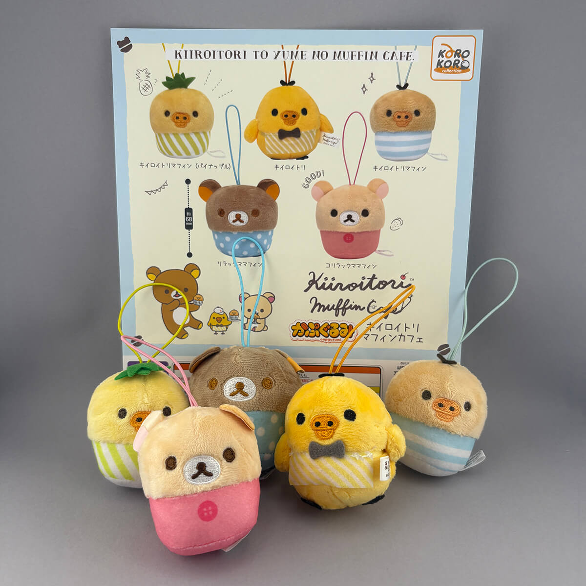 There are five different San-X Muffin Cafe characters in this Gachapon series: Kiiroitori Pineapple Muffin, Kiiroitori Cafe Clerk, Kiiroitori Muffin, Rilakkuma Muffin and Korilakkuma Muffin.