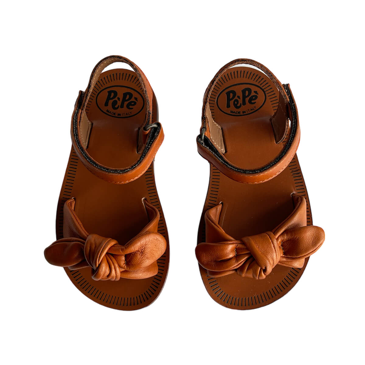 Blum bow sandals by PèPè shoes. Bow front sandals in a buttery soft vegetally tanned brown leather with adjustable velcro ankle strap fastening. Soft and flexible leather sole. Lined with 100% leather. Handmade using traditional methods in Italy.
