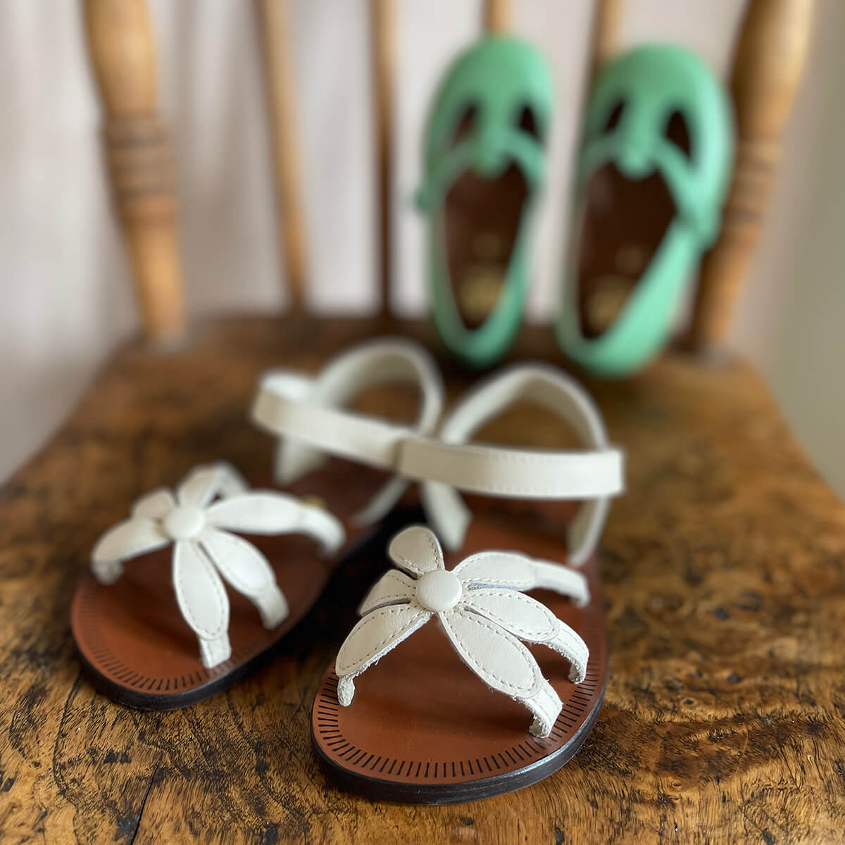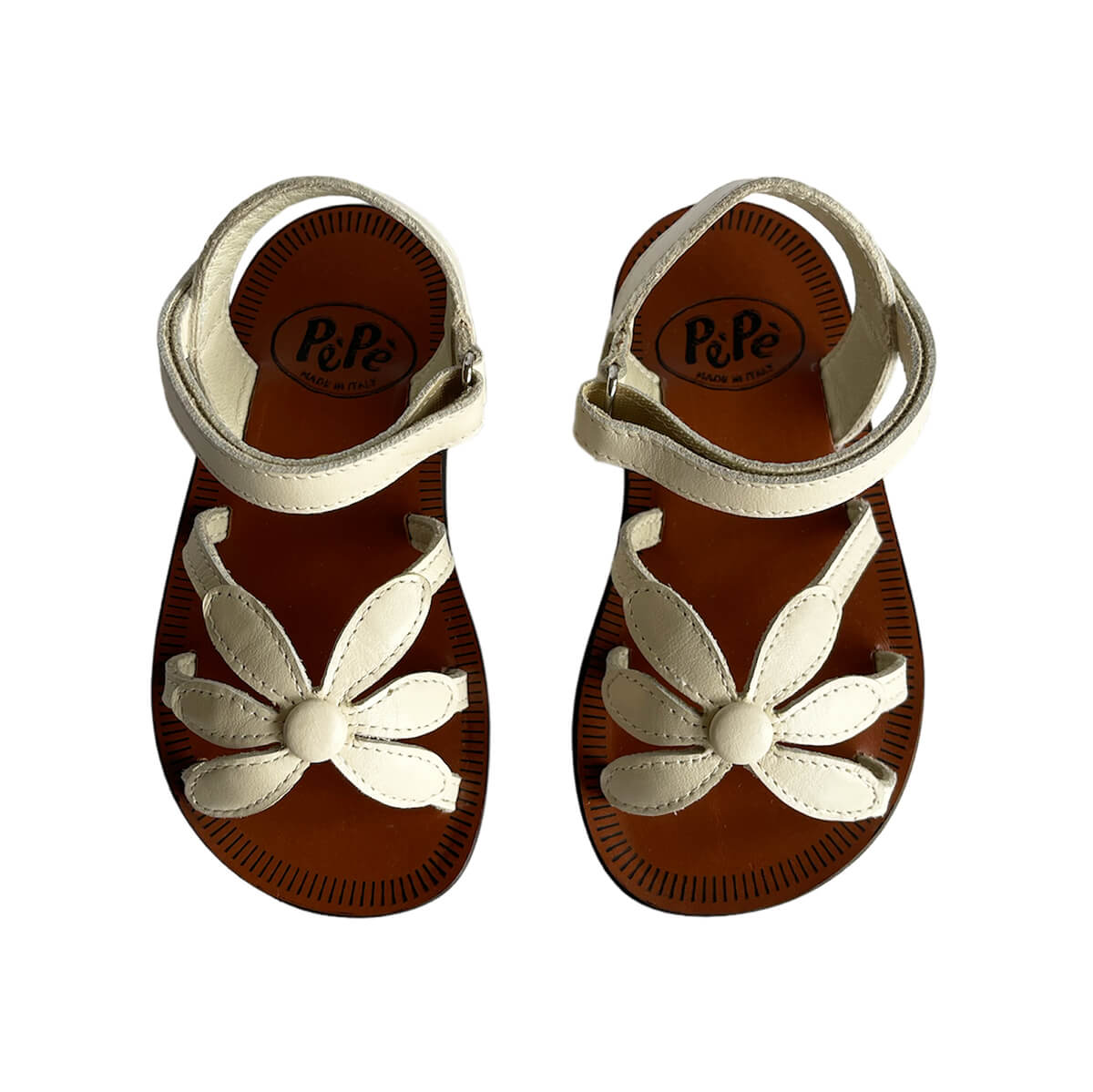 Giulia Flower sandals by PèPè shoes. Flower front sandals in a vegetally tanned white leather with adjustable velcro ankle strap fastening. Soft and flexible leather sole. Lined with 100% leather. Handmade using traditional methods in Italy.
