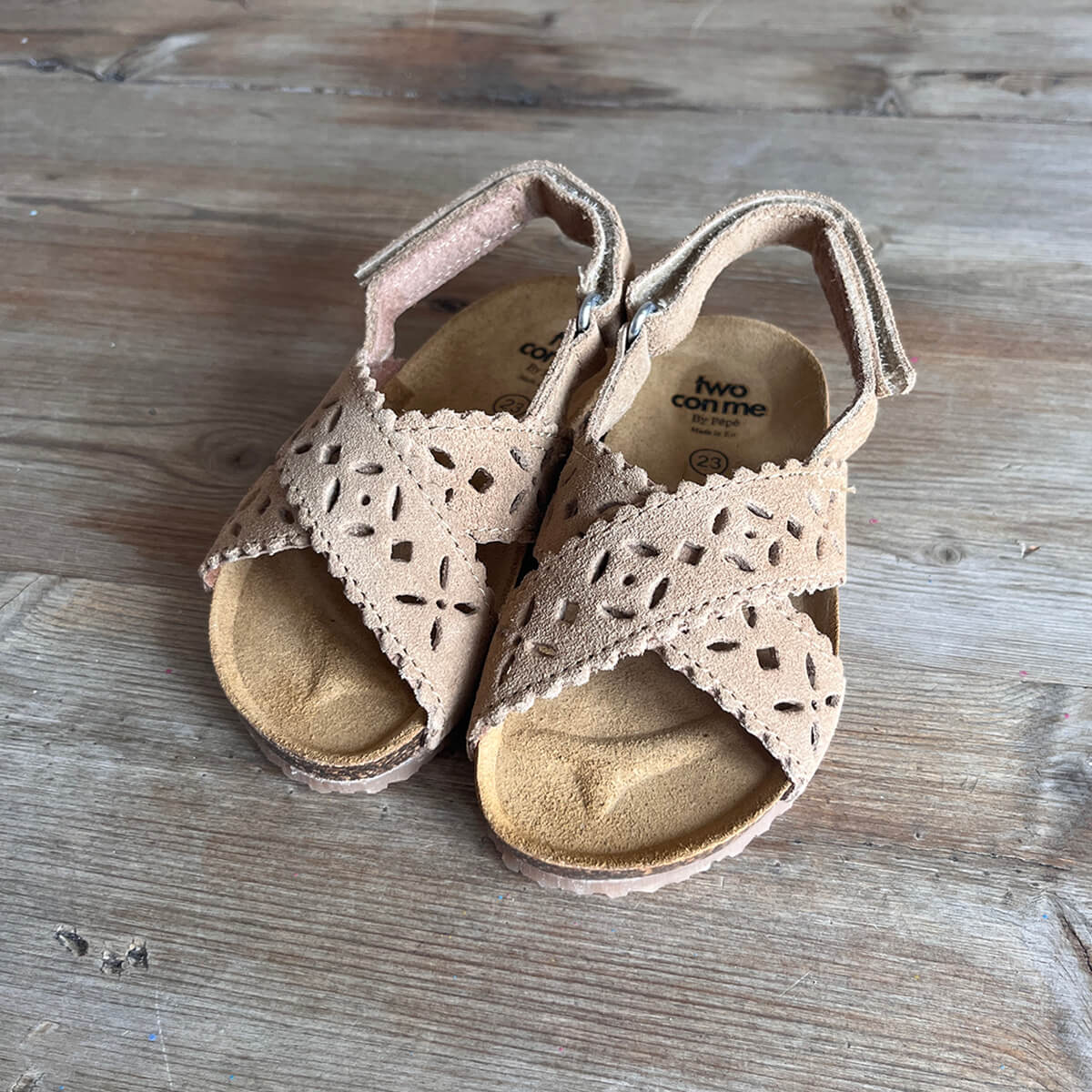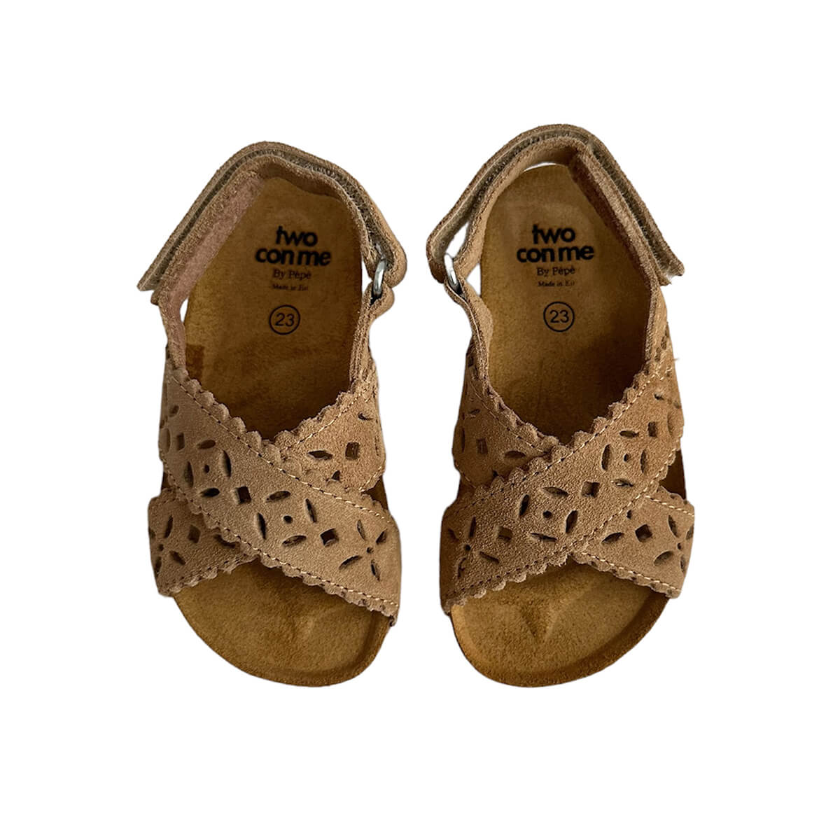 Ida crossover sandals by PèPè shoes. Two Con Me sandals in a soft suede with cut out front cross straps and adjustable velcro sling back strap fastening. Soft and flexible anatomical cork and rubber sole. Sole lined with 100% suede leather. Handmade using traditional methods in Italy.