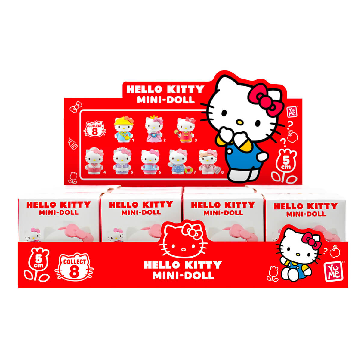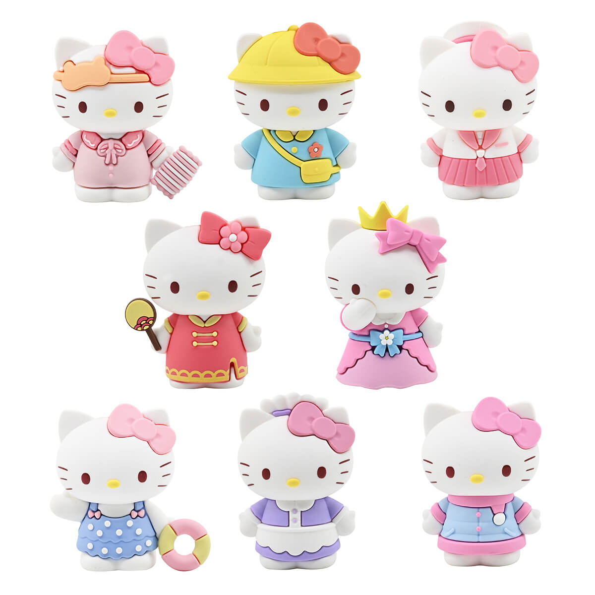 8 Hello Kitty characters to collect - Maid, Sailor, Princess, Bed Time, Kimono, Schoolgirl, Nurse, and Beachwear. Sold seperately.
