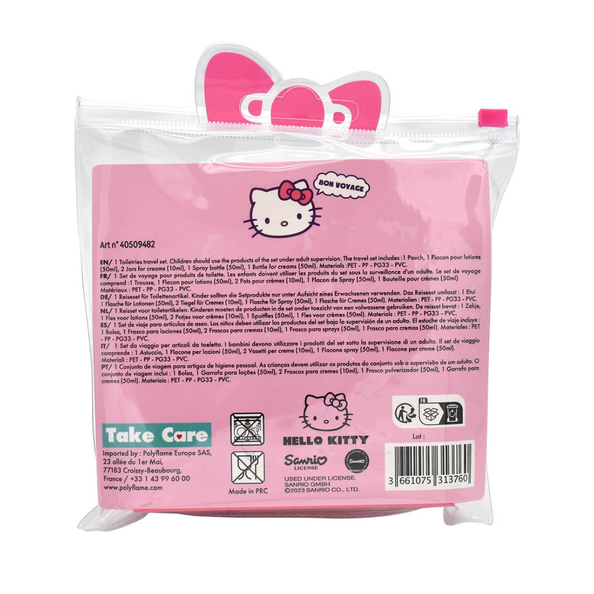 Hello Kitty Travel Kit by Take Care. Bon voyage with this super cute Hello Kitty refillable toiletry travel set perfect for hand luggage, handbags and more! Bottle sizes meet international cabin luggage safety standards, and take up minimal space. Includes a clear PVC pochette that allows travel bottles to be stored safely and facilitates the security screening process at airports.