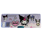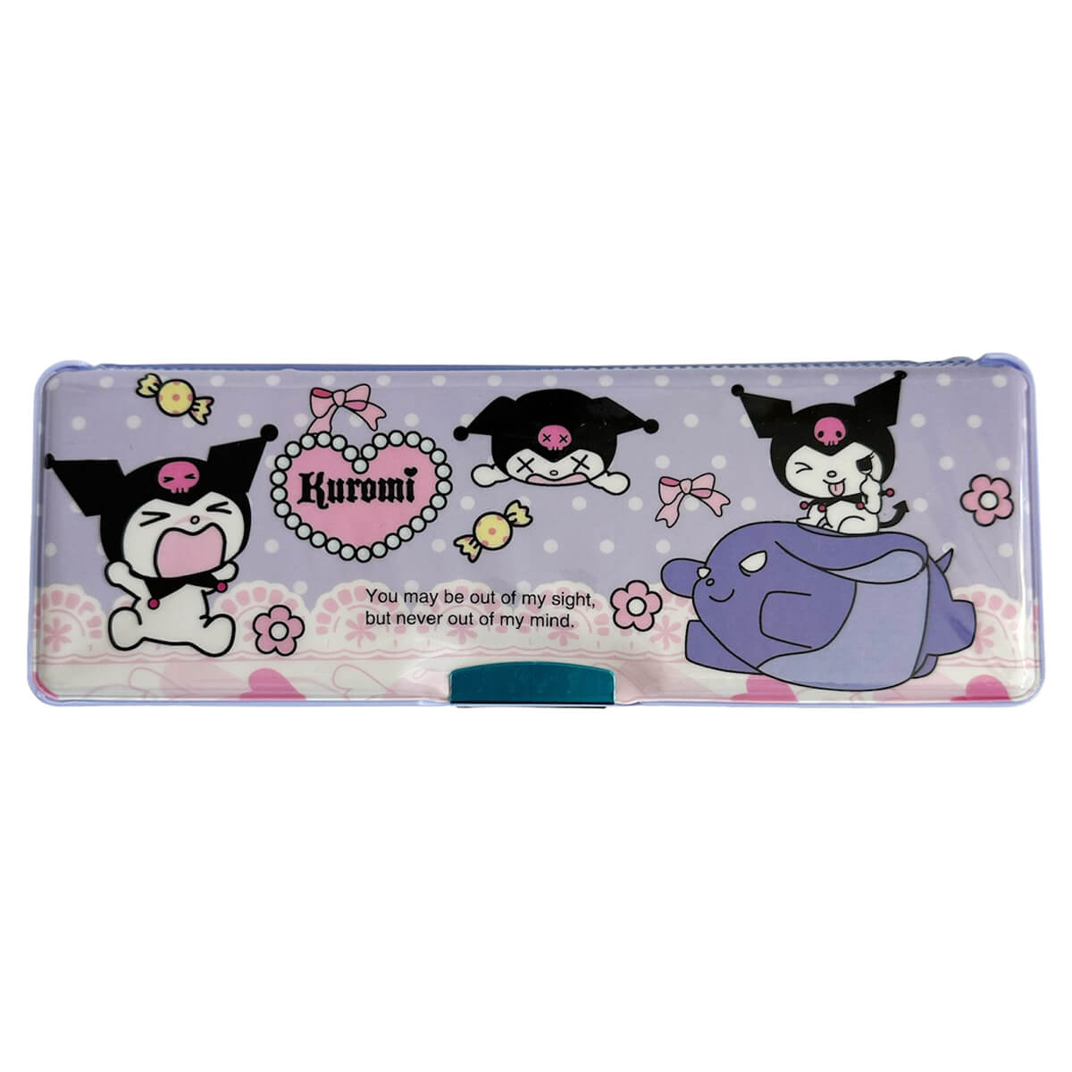 Kuromi retro 80s style vinyl pencil case by Sanrio. This fun double-sided magnetic pencil case has space on each side for storing pencil and colouring crayons. Features slots to hold pencils in place, and a small times table embossed in the bottom section. Magnetic closure both sides with a fun button-release door on the built-in dual pencil sharpener.