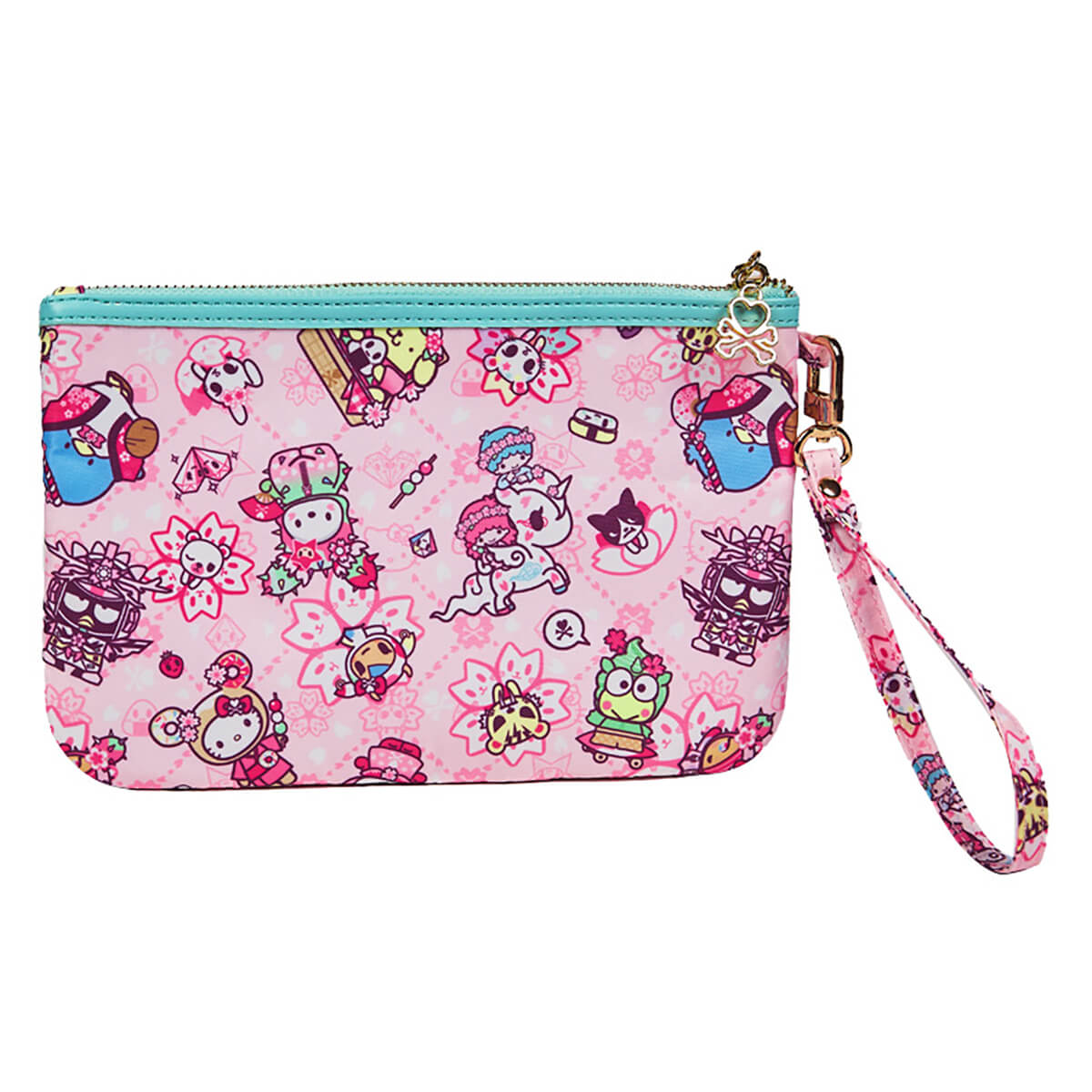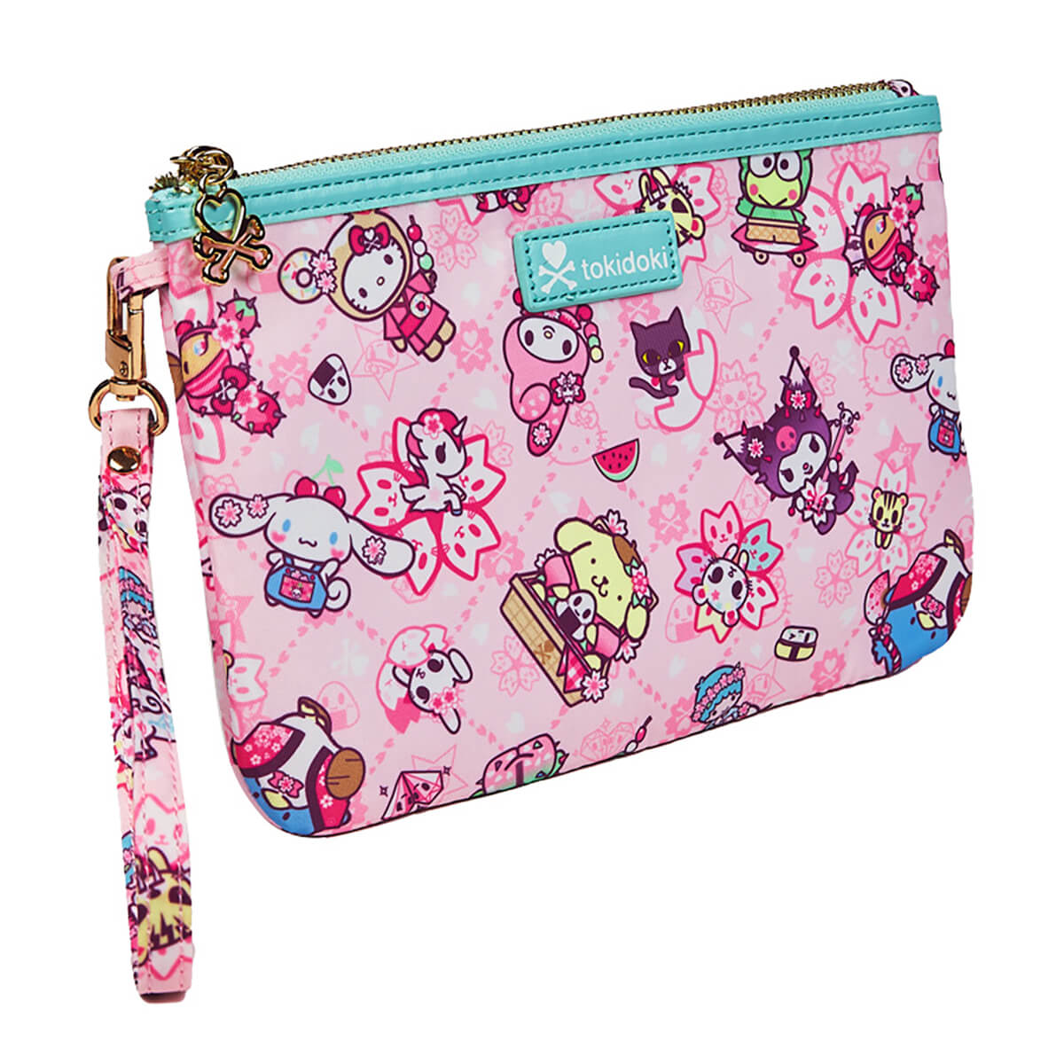 Tokidoki x Hello Kitty and Friends Sakura Festival Zip Pouch Wristlet by Tokidoki. From the Sakura Festival collection by Tokidoki comes this super cute wrist pouch with an all over graphic Hello Kitty and Friends print with a pink cherry blossom background. Features a zippered main compartment with an ice blue trim and lining, Tokidoki logo zipper pull and a detachable wristlet strap. Gold tone hardware and logo patch.