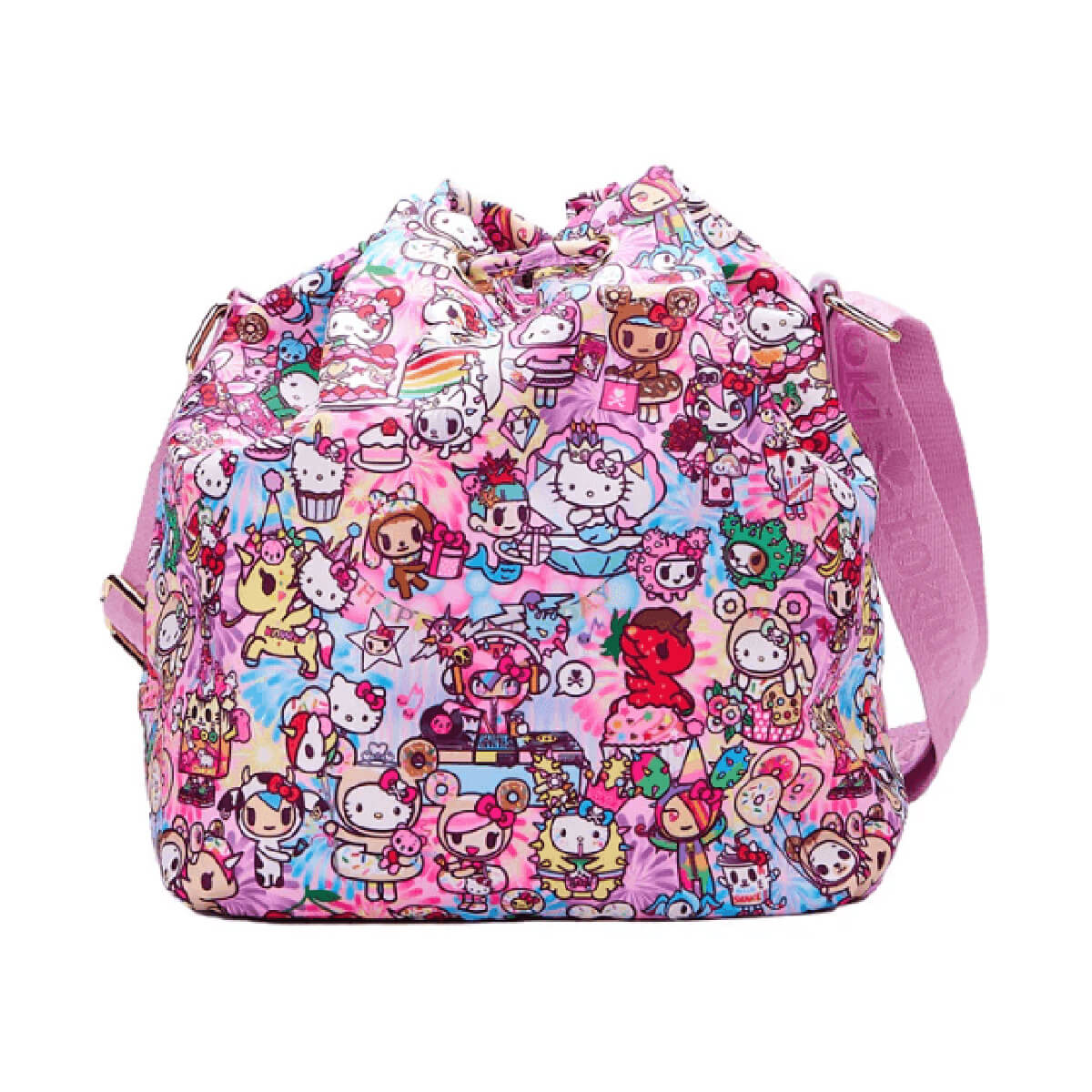 Tokidoki x Hello Kitty and Friends Birthday Bash Bucket bag by Tokidoki. From the 50th Birthday Bash collection by Tokidoki comes this super cute bucket bag with an all over graphic Hello Kitty Birthday Bash print with celebratory cakes and your favourite Tokidoki characters too. Features a strurdy drawstring closure and adjustable cross body / shoulder strap. Gold tone hardware and logo patch.