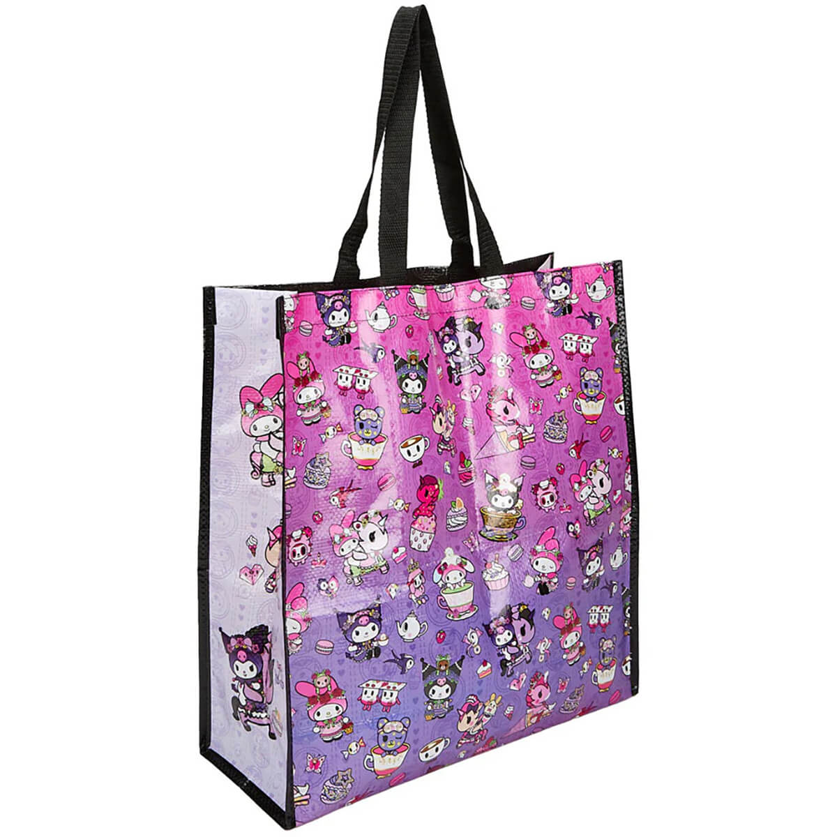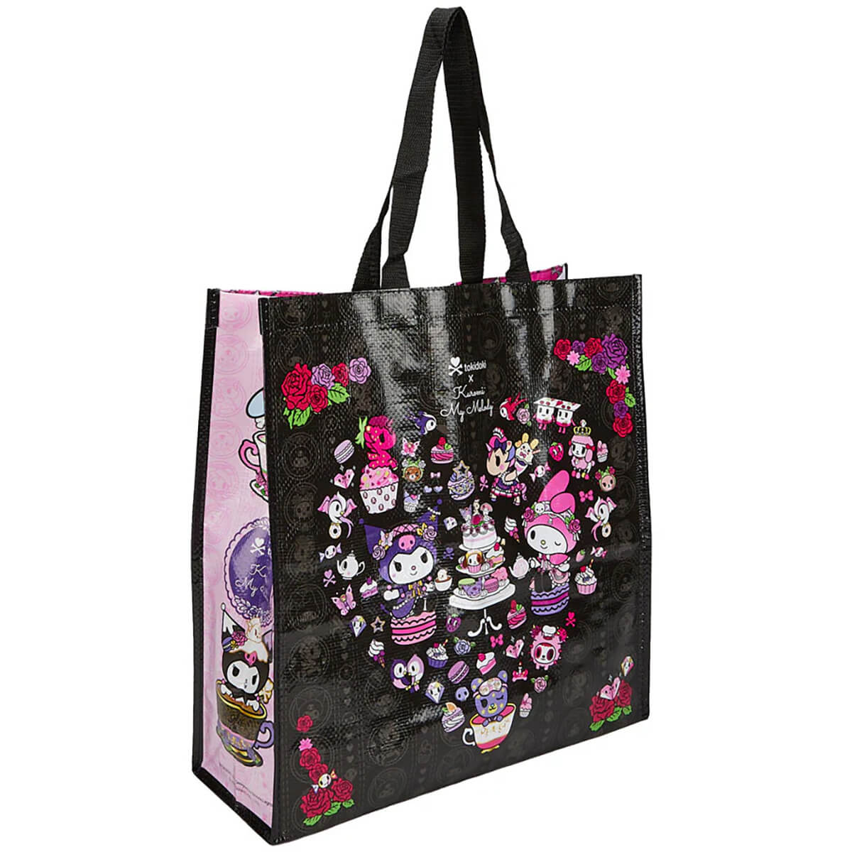 Tokidoki x Kuromi & My Melody Garden Party Vinyl Tote by Tokidoki. Vinyl tote bag with Kuromi and My Melody tea party print on front, back and sides, with a handy inner pocket - perfect for shopping with a sturdy handle made from black webbing. Double sided graphic print featuring Kuromi and My Melody in tokidoki-fied style while they enjoy tea and cake in the garden on a beautiful day!