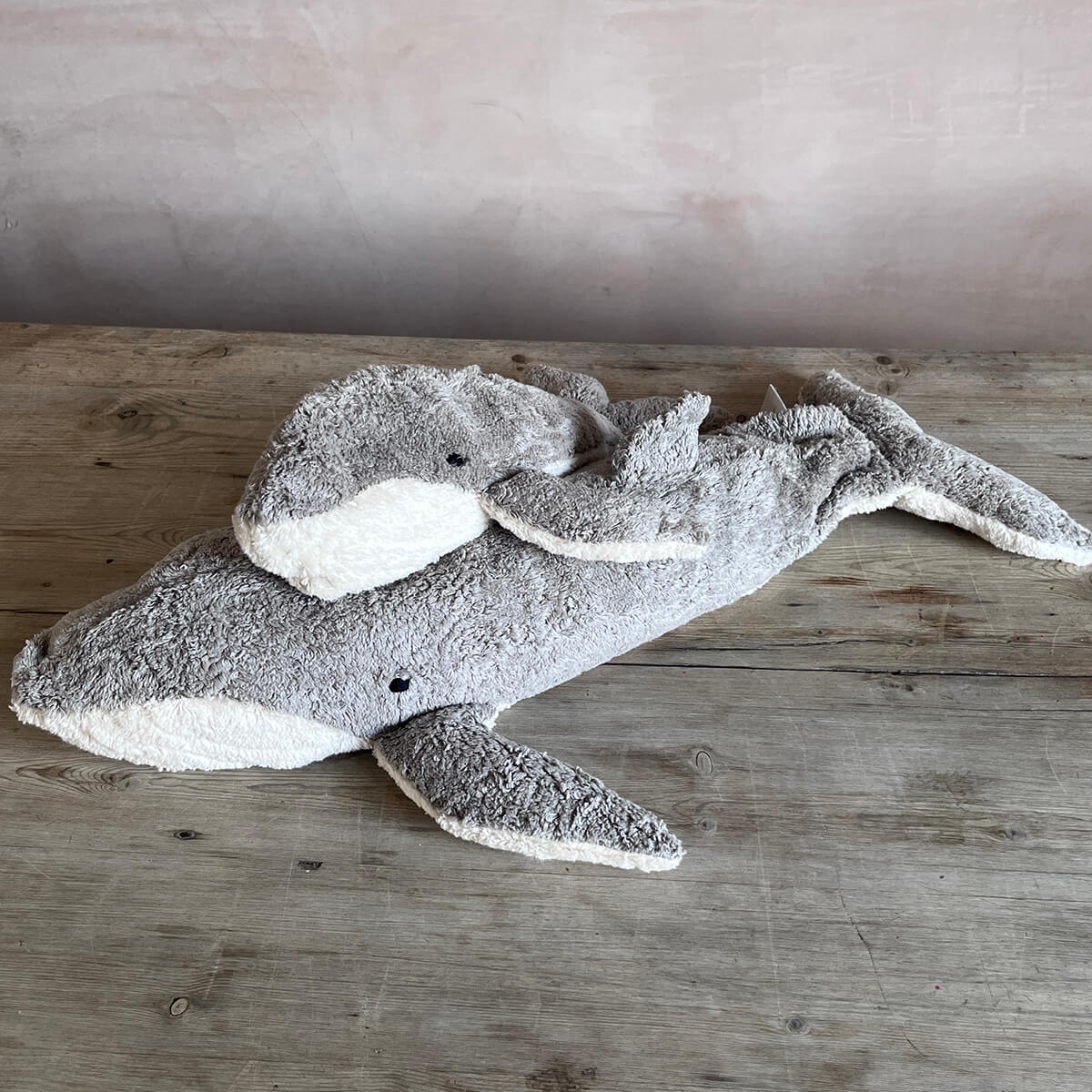 Whale large cuddly animal in grey by Senger Naturwelt. Super soft organic cotton cuddly toy and warming pillow in one. The whale's belly has a zipper compartment with a pillow filled with spelt, which can be warmed or cooled. The head and feet are filled with lambswool and the fur is made from cotton.
