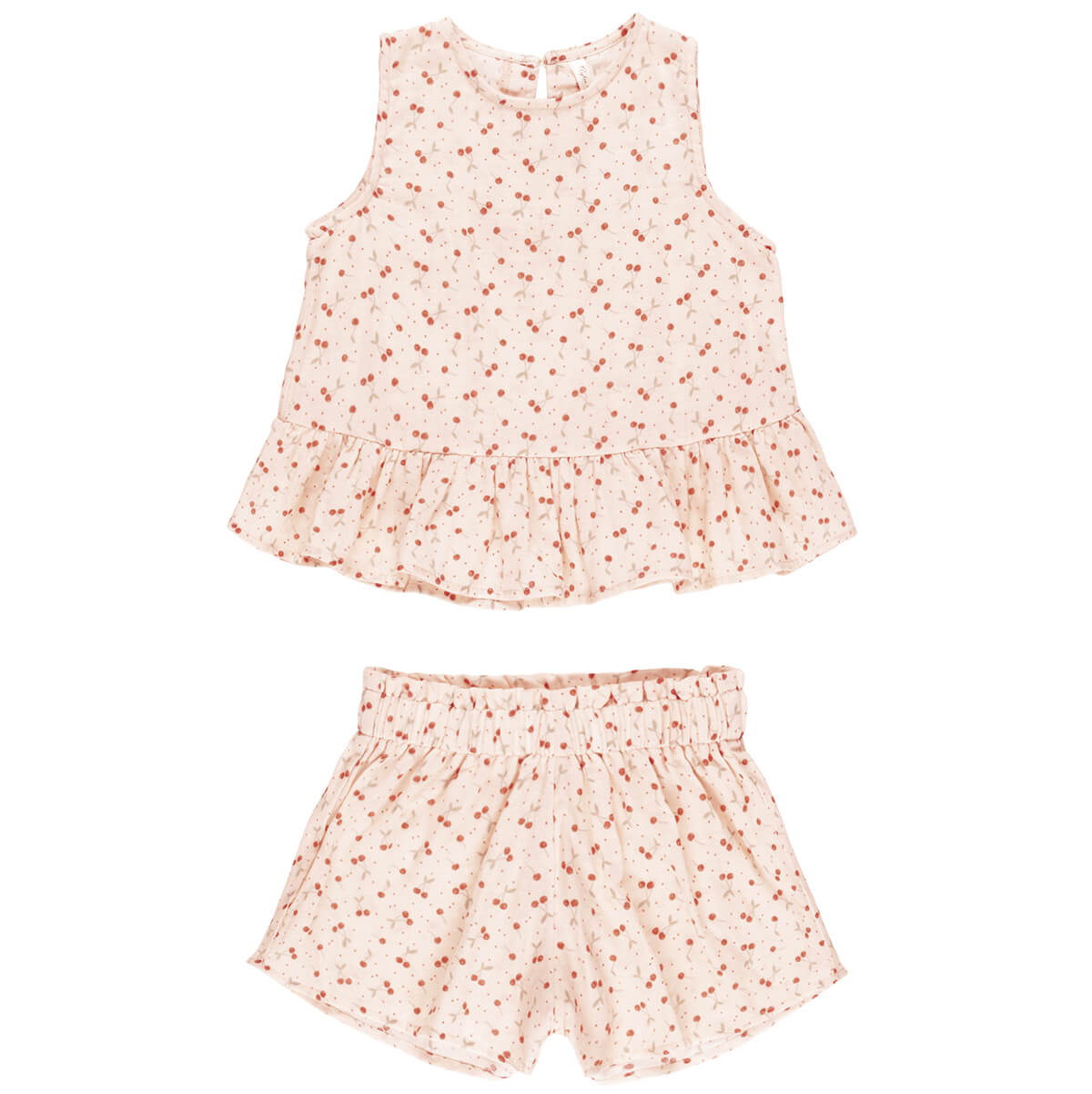 Liliana Sun Set by Rylee & Cru. A sleeveless top with gathered hem and matching shorts featuring a cherries print on shell.
