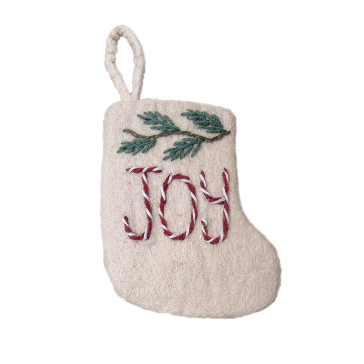 Joy Mini Stocking Christmas Decoration by Shirley Bredal. A pure wool felted Christmas stocking decoration with hand embroidered details. The miniature size of this stocking makes it perfect for a range of uses beyond just hanging on the tree. Use it as a unique gift holder, a table setting accent, or even a creative party favor at your holiday gatherings. Its beautifully embroidered joy and pine branch motif adds a touch of festive elegance that ensures it's not only a seasonal decoration but also a cherished keepsake that can be enjoyed year-round.