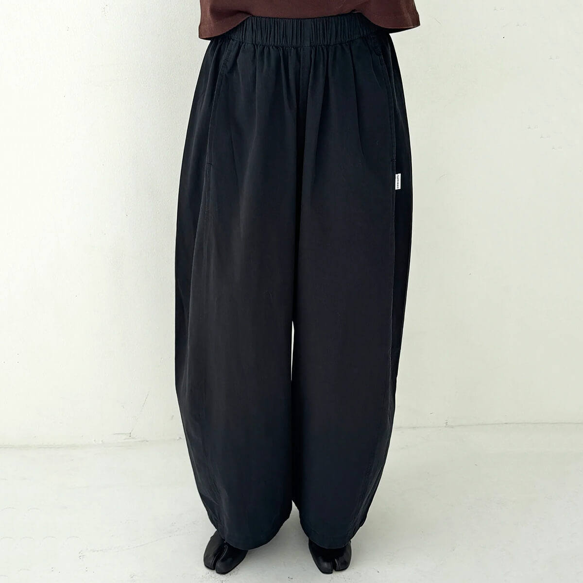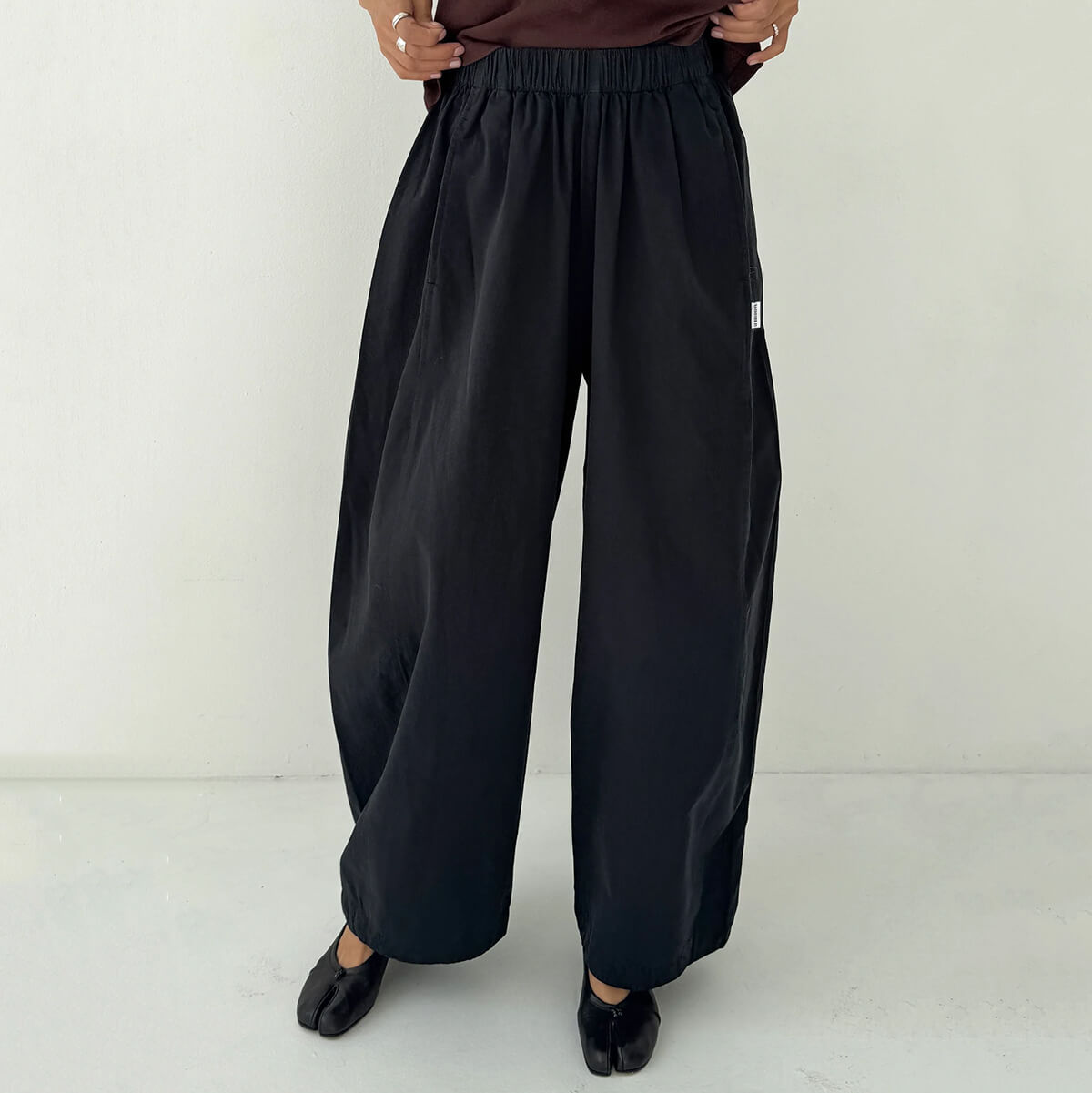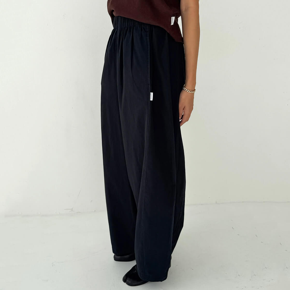 Parachute Pants by Le Bon Shoppe. Billowy trousers made to move with you throughout the day. Crafted from a light yet durable and elevated cotton, they're the kind of pair you can wear anywhere, from casual moments to polished looks. Designed with an elastic waist and side pockets, their unique leg shape sets them apart. A third side panel adds extra volume, creating a sculptural silhouette that’s relaxed, airy, and full of movement.