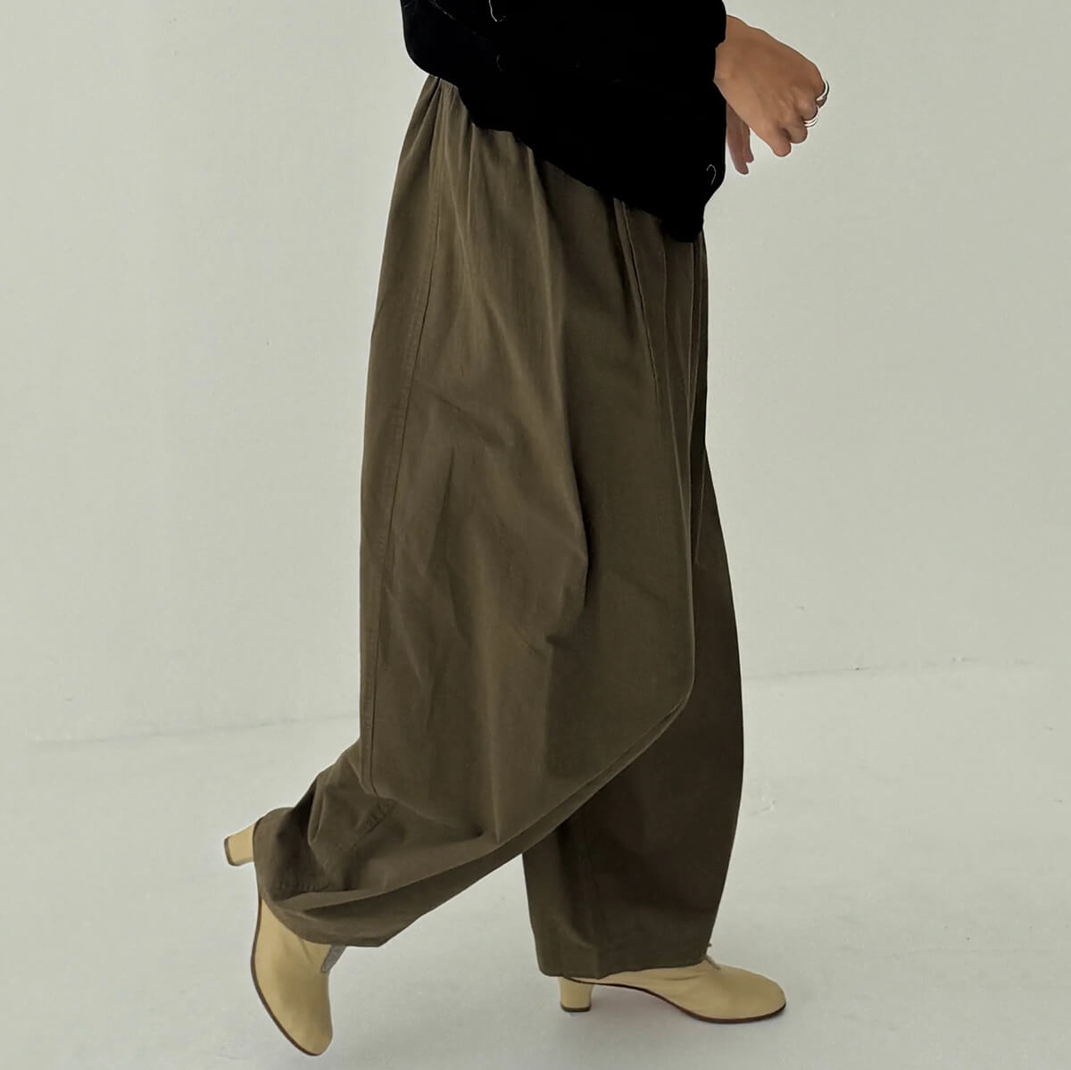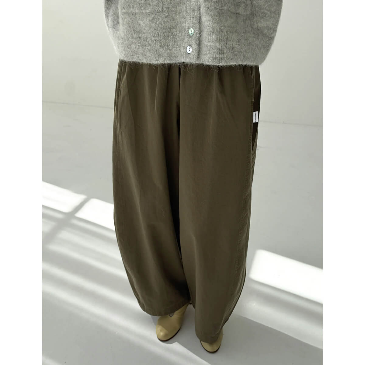 Parachute Pants by Le Bon Shoppe. Billowy trousers made to move with you throughout the day. Crafted from a light yet durable and elevated cotton, they're the kind of pair you can wear anywhere, from casual moments to polished looks. Designed with an elastic waist and side pockets, their unique leg shape sets them apart. A third side panel adds extra volume, creating a sculptural silhouette that’s relaxed, airy, and full of movement.
