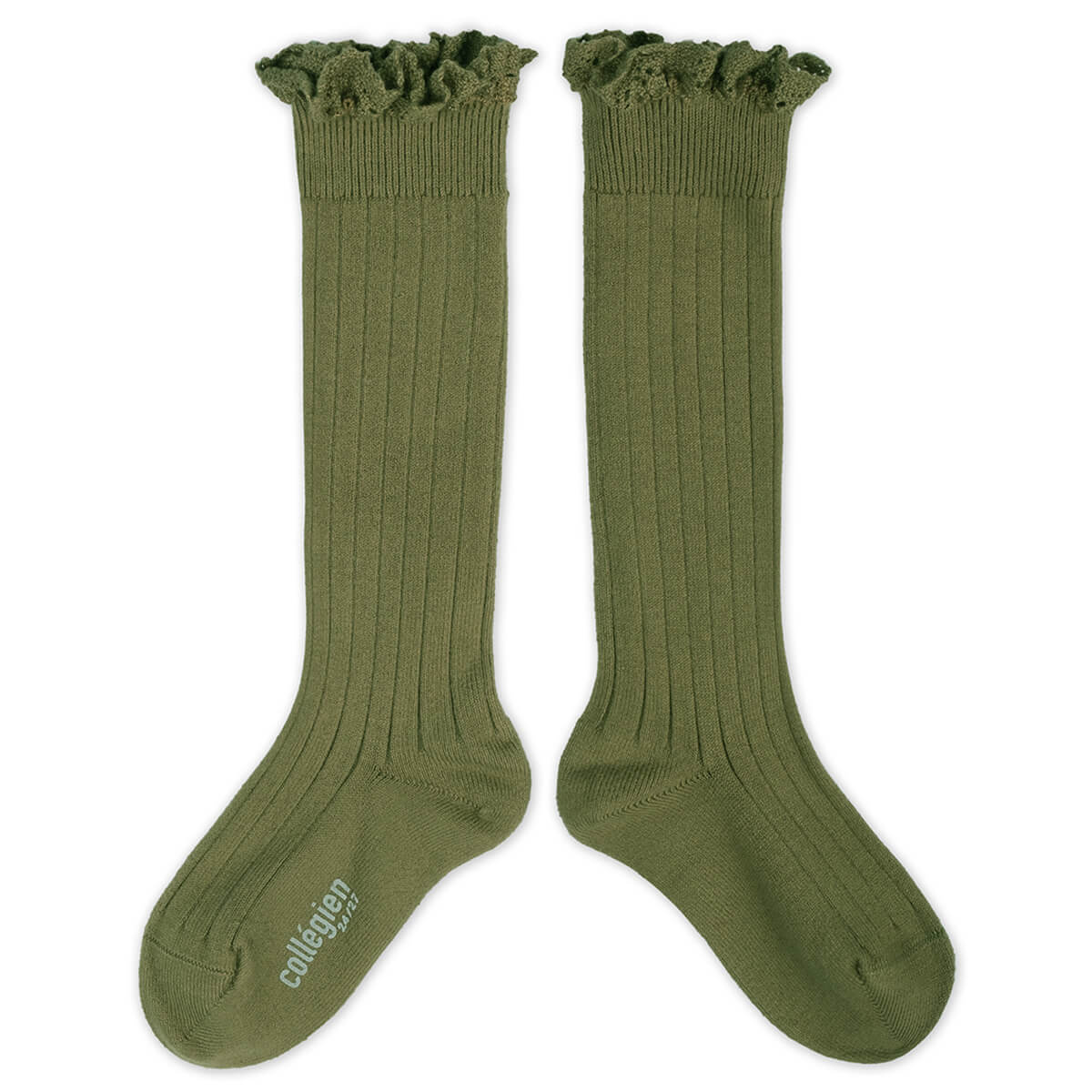 Josephine Lace Trim Ribbed Knee High Socks in Olive Du Luberon by Collegien