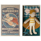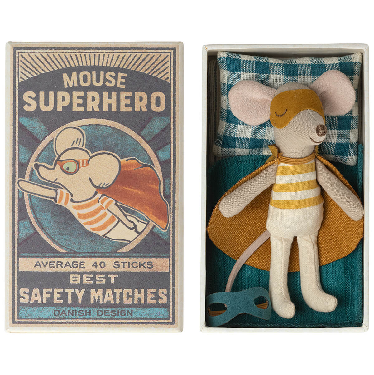 Super Hero little brother mouse by Maileg. Superhero Mouse is a classic Maileg item. This mouse is ready for hours of play and sleeps tight in a little matchbox. The clothes and bed linen come in unique prints and beautiful colours. 2 masks included.