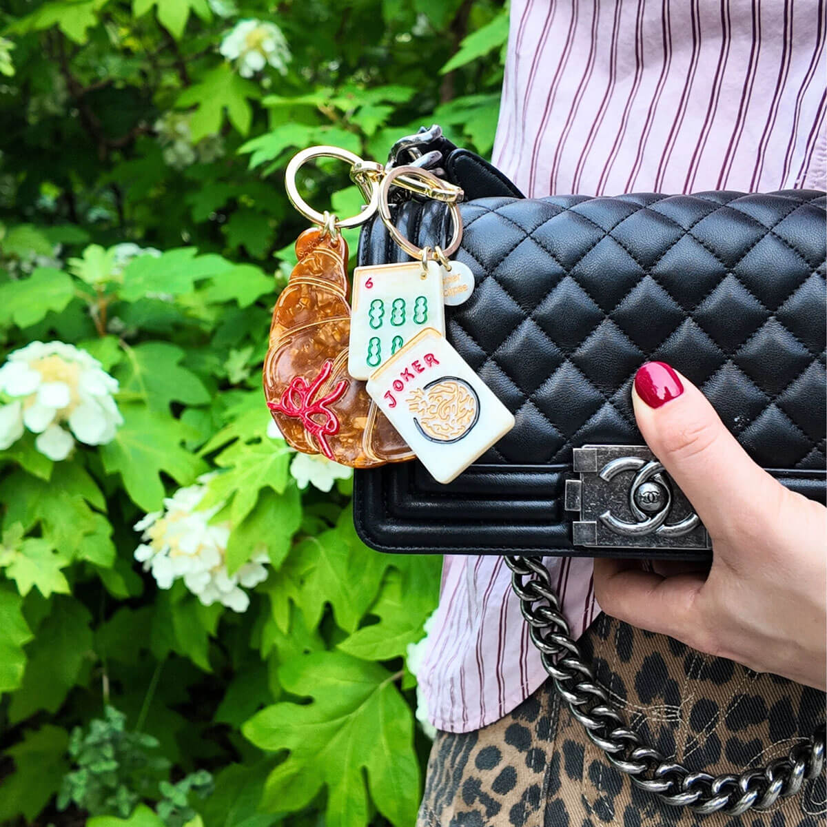 Please note that due to the nature of the material and hand-painted finish, each bag charm may have differences in colour and pattern.