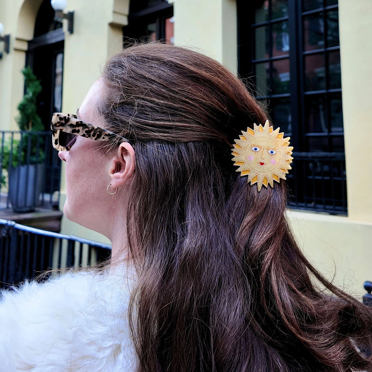 Celestial Sun Hair Claw by Solar Eclipse. Hand-painted by the Solar Eclipse artists, this original celestial sun claw clip is crafted in small batches. It's designed to upgrade your routine and be treasured for years to come. Designed in New York City, this clip is double-sided, for a perfect look from all angles. Crafted from eco-friendly cellulose acetate, a sustainable and biodegradable material made from recycled wood pulp, this clip offers both beauty and responsibility.