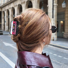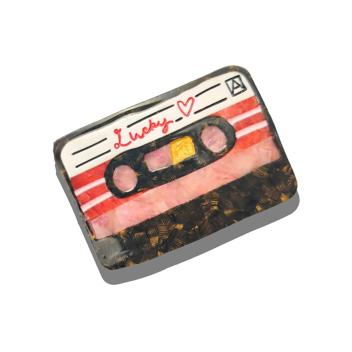 Lucky Cassette Hair Claw by Solar Eclipse. Hand-painted by the Solar Eclipse artists, the original lucky cassette hair claw clip is crafted in small batches. It's designed to upgrade your routine and be treasured for years to come. Designed in New York City, this clip is double-sided, for a perfect look from all angles. Handmade with the signature biodegradable acetate made from recycled wood pulp, it effortlessly holds hair for a secure all-day style. Features an extra strong hinge, promoting long-lasting styles for all-day wear.