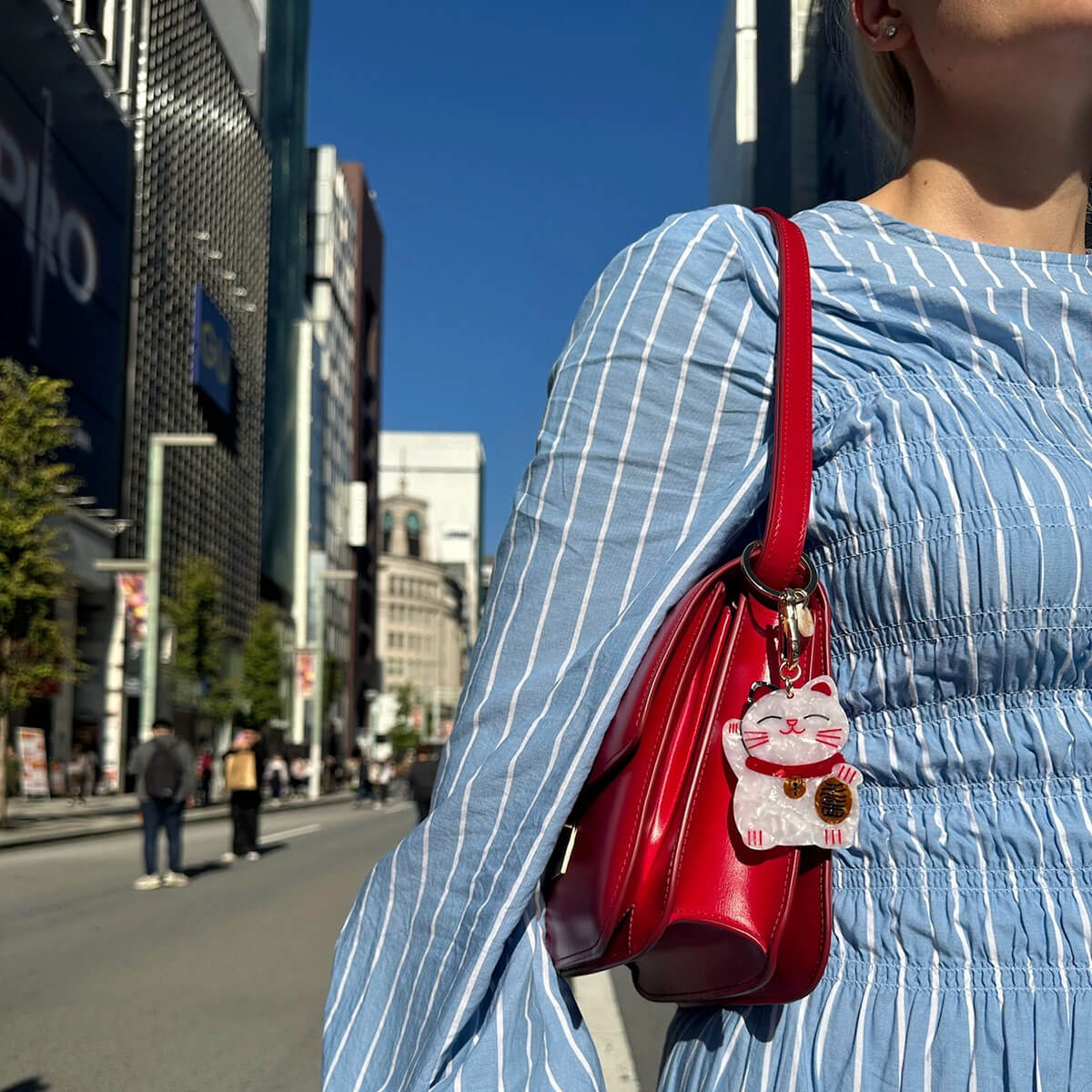Lucky Cat Bag Charm by Solar Eclipse. Playful, iconic, and full of charm, the Lucky Cat (maneki-neko) bag Charm is inspired by Japan’s beloved symbol of prosperity and protection. Hand-painted on both sides and crafted from biodegradable acetate, this collectible transforms an iconic cultural figure into a wearable treasure. Whether you’re inviting good fortune or simply drawn to its joyful spirit, this charm adds a touch of Japanese tradition and whimsy to your bag or keys. Designed in NYC by the Solar Eclispe all-female team and made in small batches, it’s the perfect blend of eco-conscious craftsmanship and cultural storytelling.