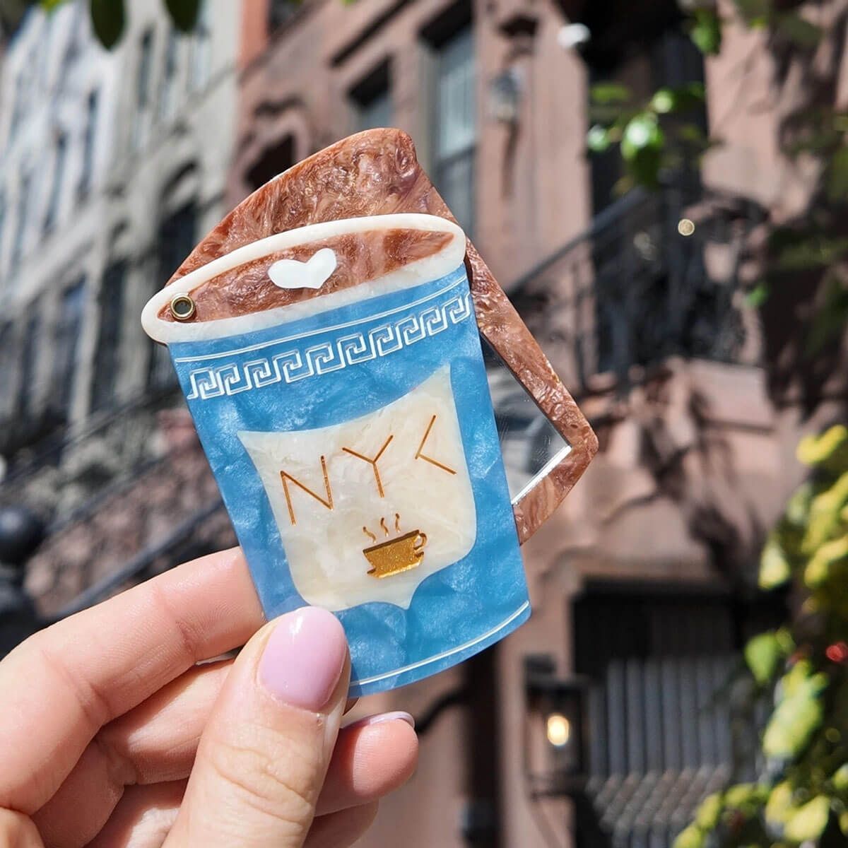 NYC Coffee Cup Compact Mirror by Solar Eclipse. The Compact Mirror is a contemporary handbag essential, intentionally designed in New York City to bring beauty and function to your everyday routine. Crafted in small batches, this slim mirror is your on-the-go bestie. Perfect for a quick lip check, smoothing stray hairs, or a midday moment of glam. It’s pretty enough to flash and small enough to fit in even your tiniest baguette bag. Each coffee cup compact mirror features an original, hand-painted design by the artists at Solar Eclipse.